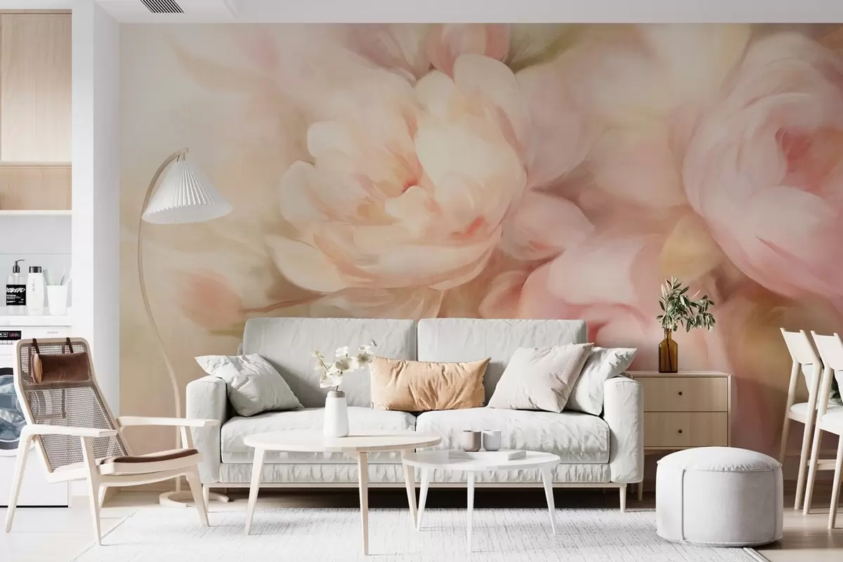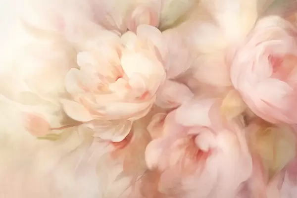 Fototapet Bujori roz pal și crem, estompați, cu imitații de pensule moi, picturale, creând un aranjament floral texturat. Nr. w09556