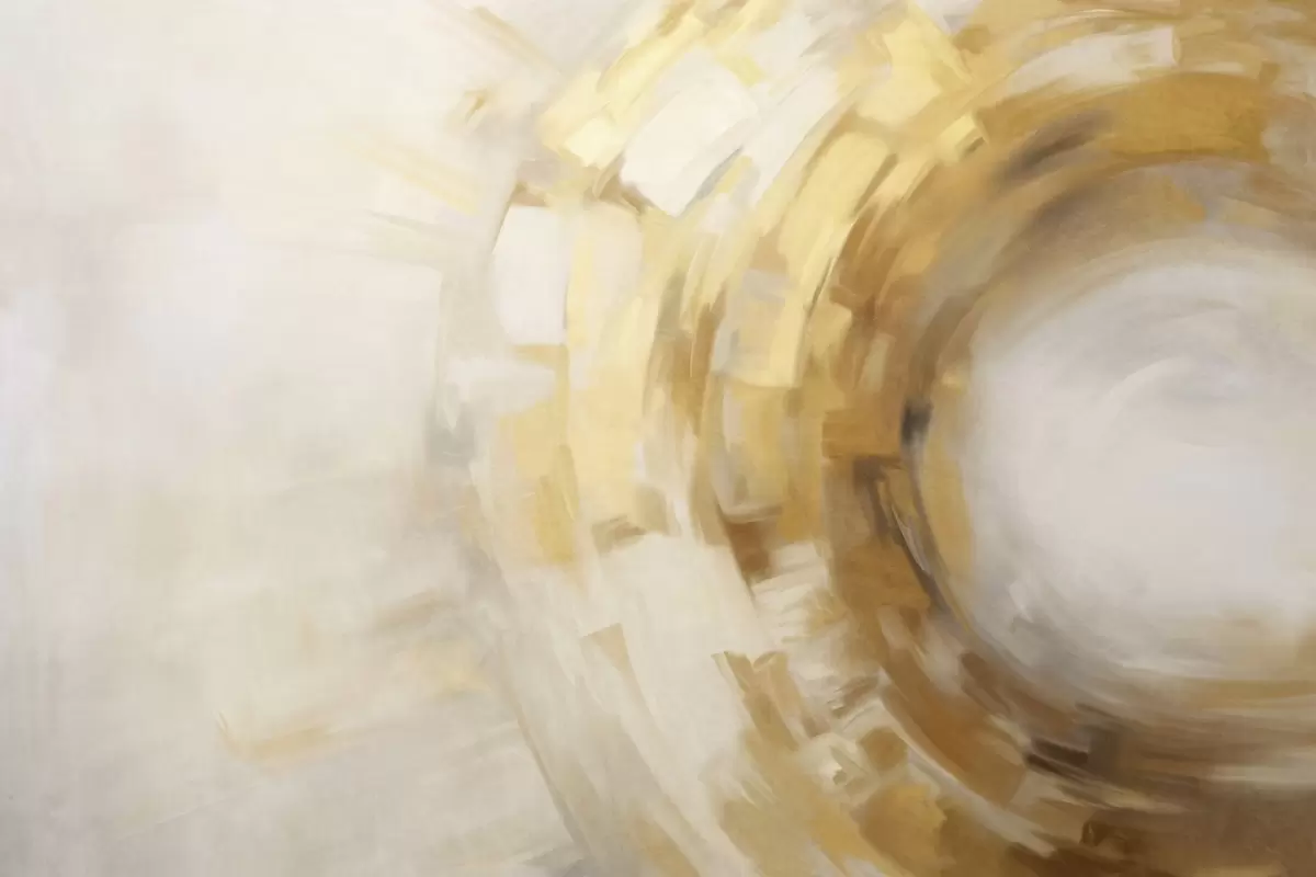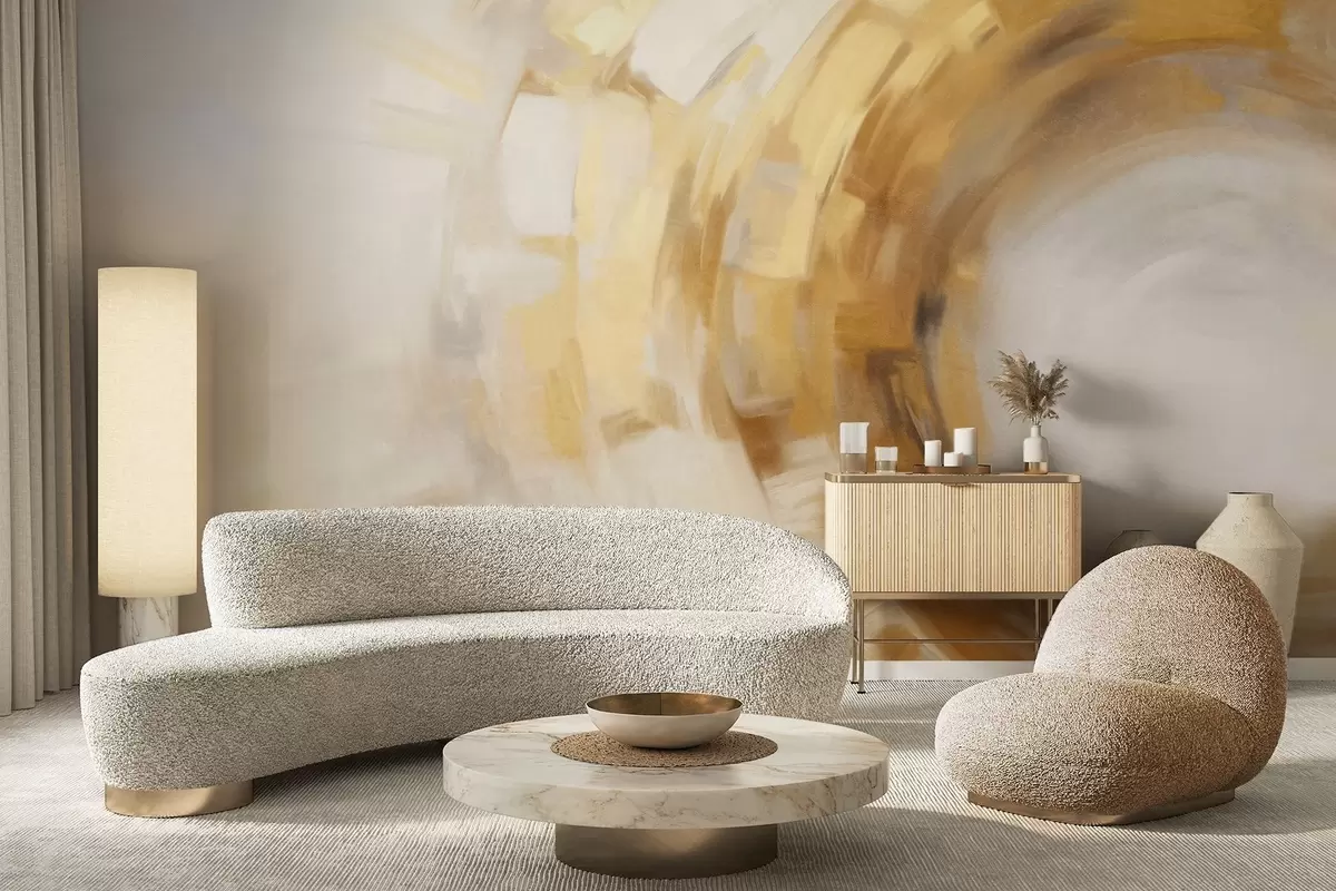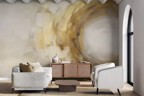 Fototapet Imitare de pictură abstractă cu pensule circulare texturate în galben și alb, creând o senzație de mișcare Nr. w09558