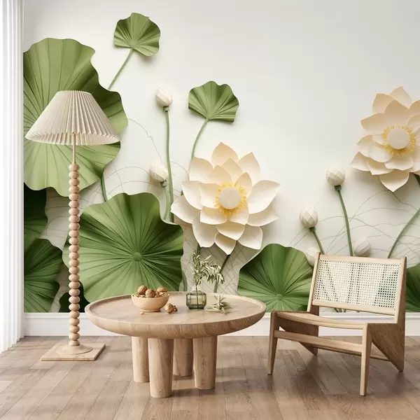 Fototapet Flori de lotus 3D cu frunze verzi texturate, stil minimalist Nr. w09560