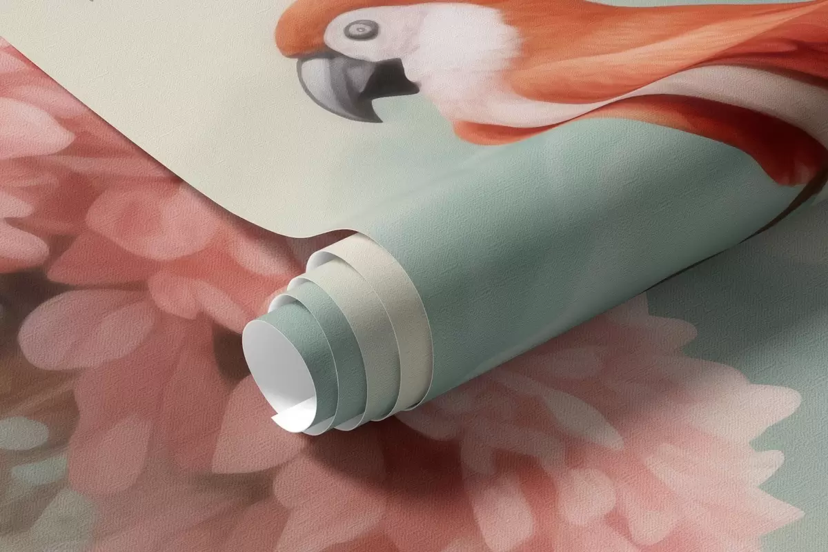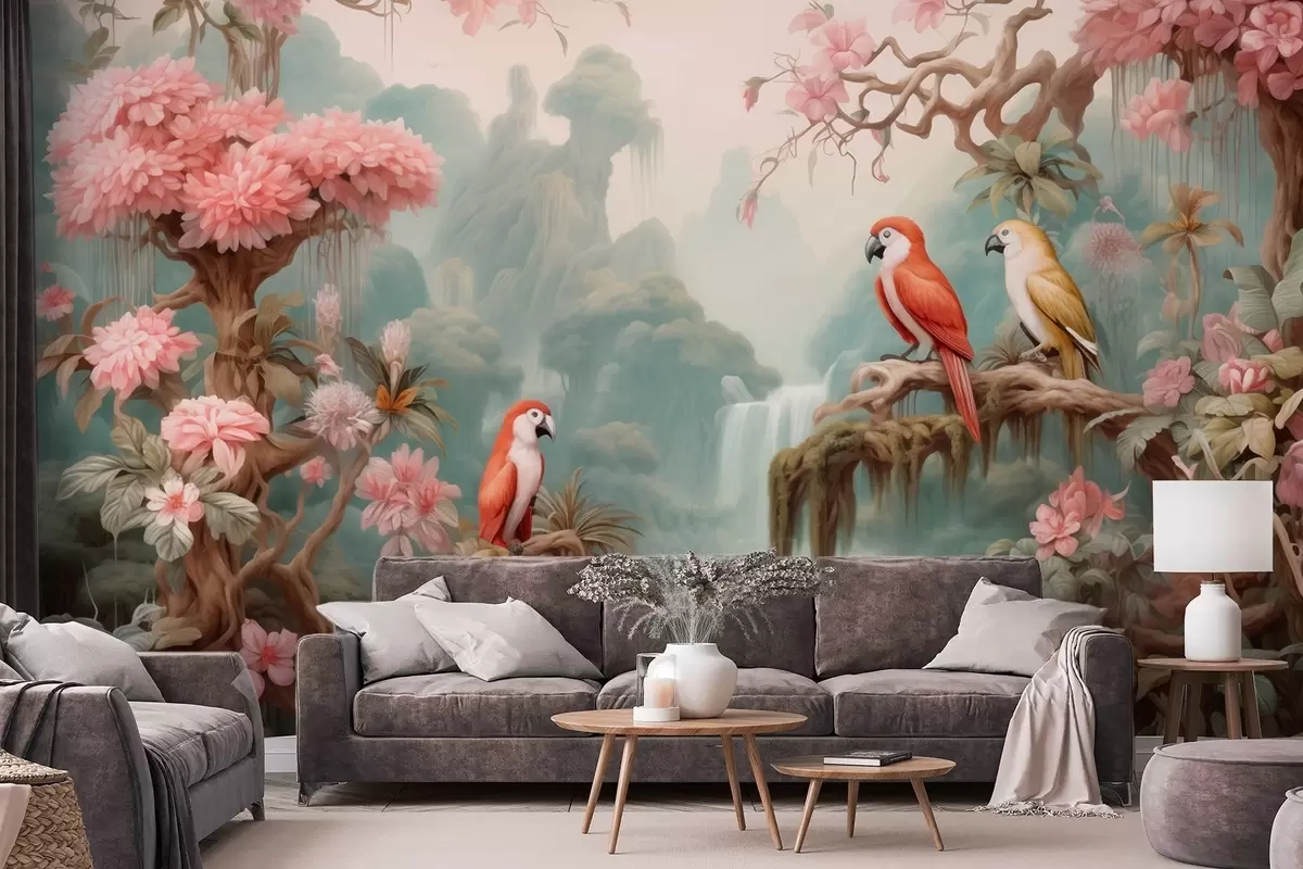 Fototapet O pădure tropicală de basm, cu papagali, copaci înfloriți cu flori roz și o cascadă. Nr. w09580