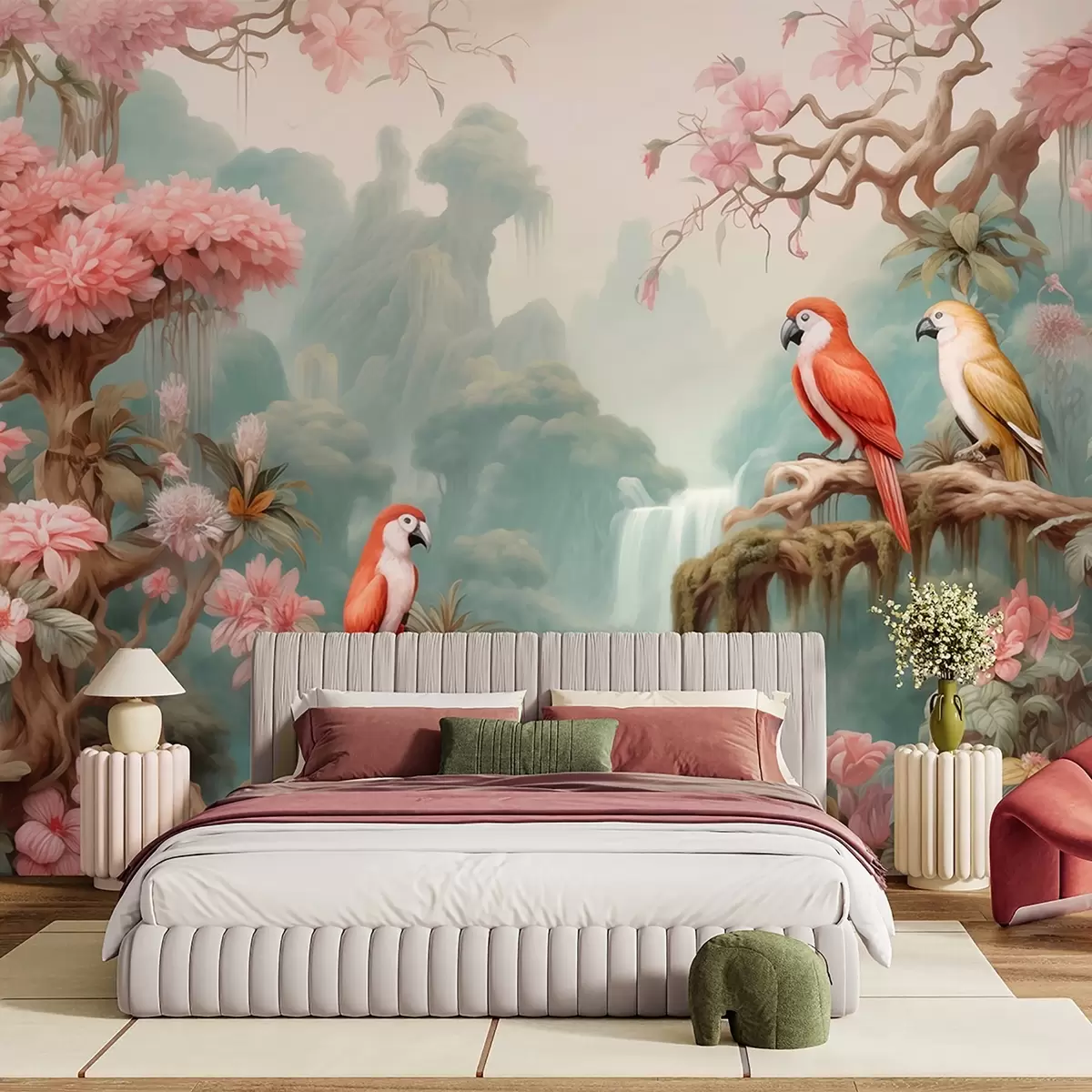 Fototapet O pădure tropicală de basm, cu papagali, copaci înfloriți cu flori roz și o cascadă. Nr. w09580