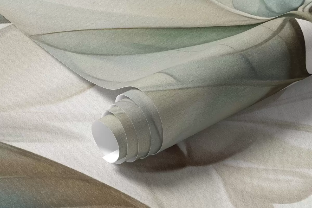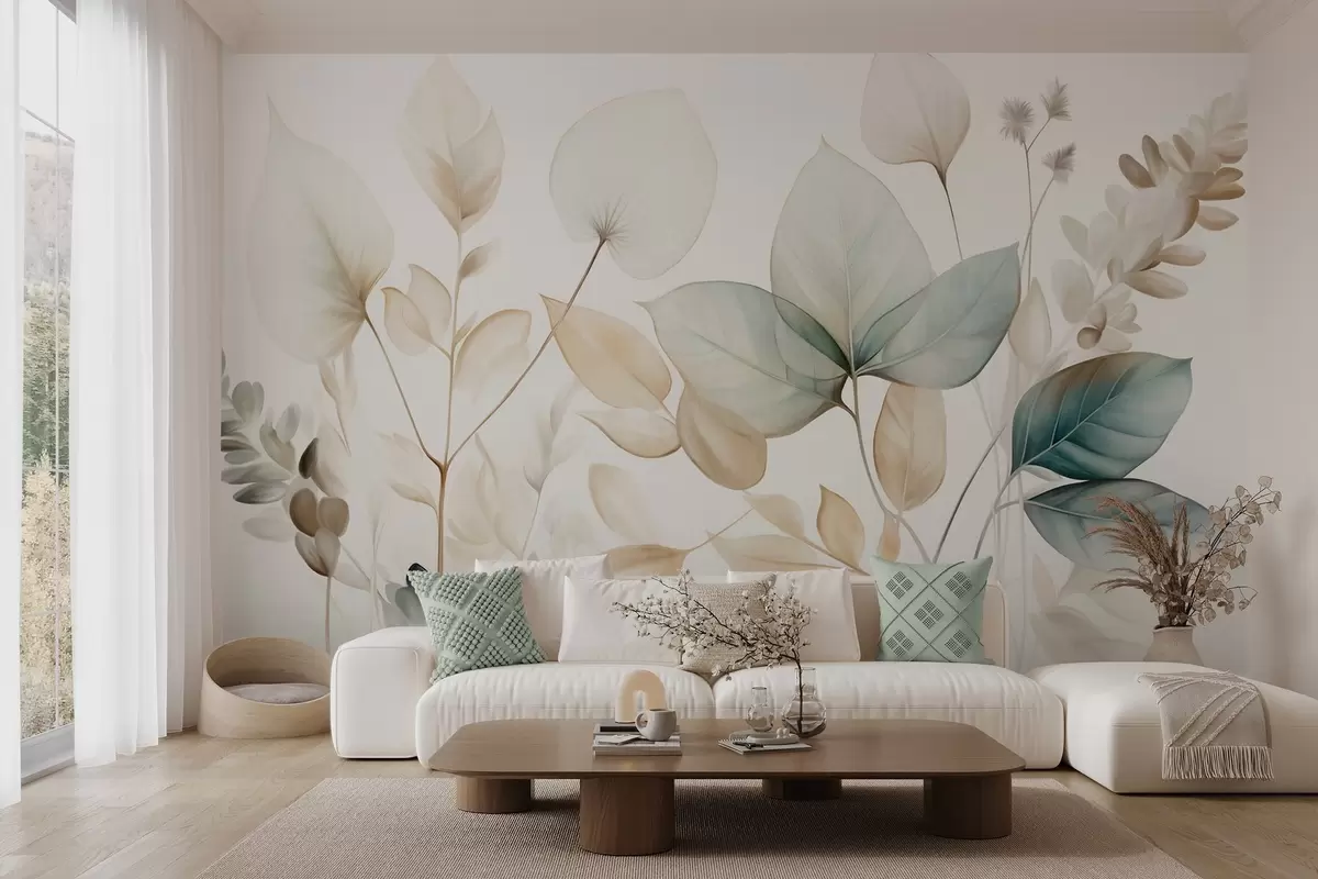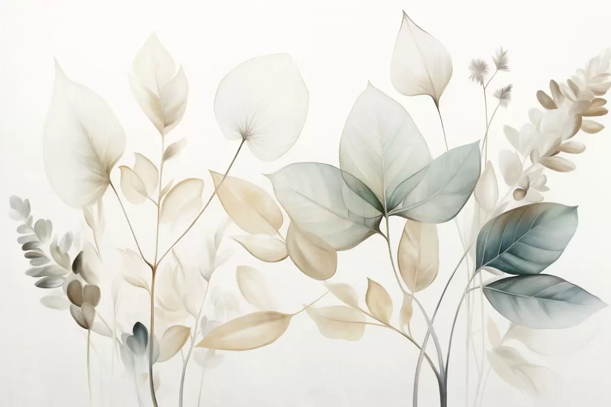 Fototapet Frunze translucide texturate în nuanțe discrete de bej și verde-albastru, cu tulpini delicate pe un fundal moale și deschis. Nr. w09583