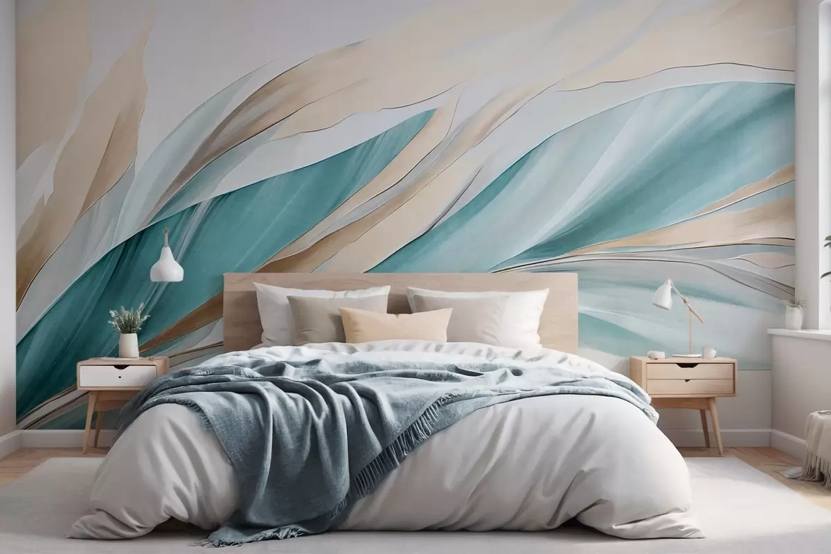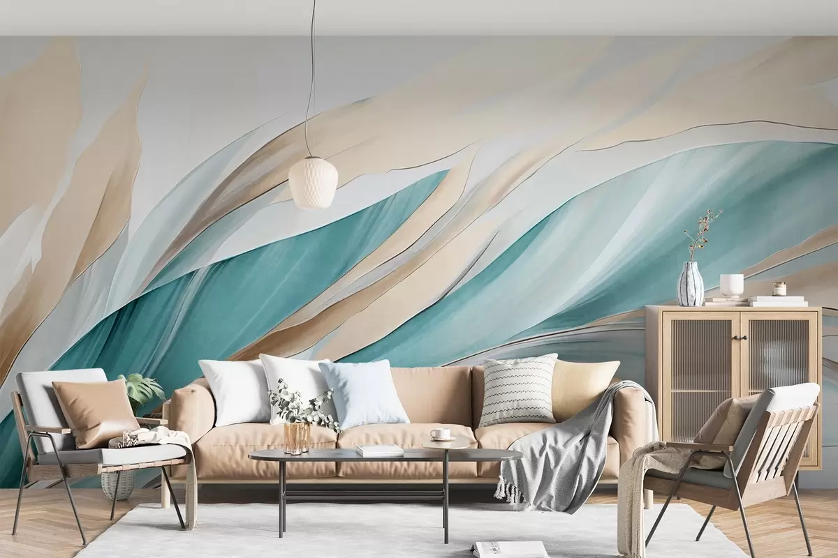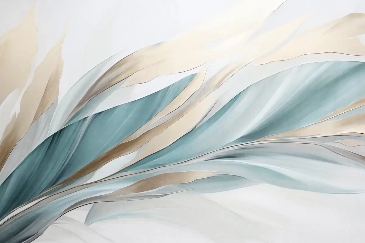 Fototapet Valuri abstracte de culoare verde-albăstrui și galben, cu forme și linii subțiri, pe un fundal alb, artă texturată Nr. w09585