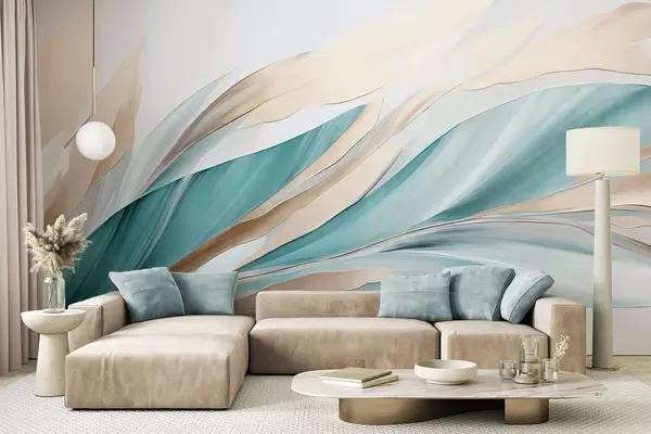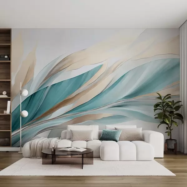 Fototapet Valuri abstracte de culoare verde-albăstrui și galben, cu forme și linii subțiri, pe un fundal alb, artă texturată Nr. w09585