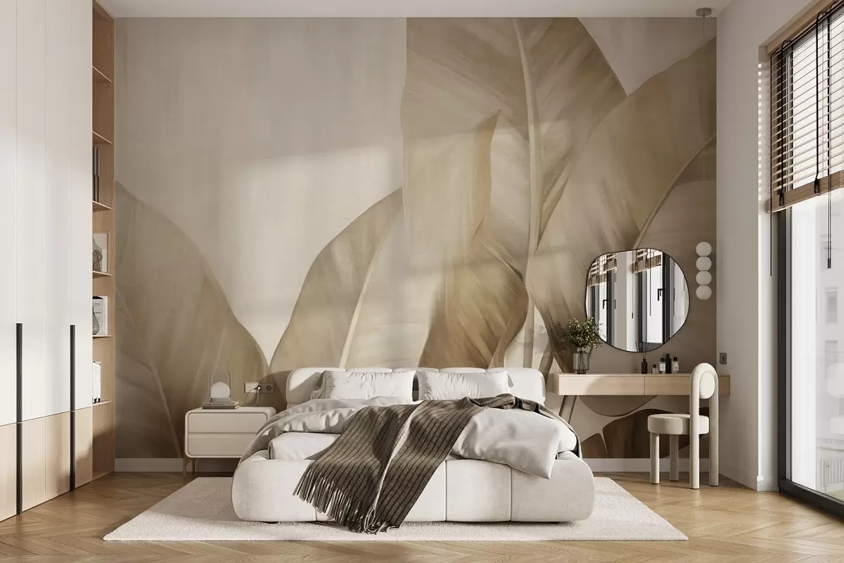 Fototapet Frunze mari de bananier, maro deschis, cu textură, pe un fundal bej deschis, cu o estetică delicată și minimalistă. Nr. w09586