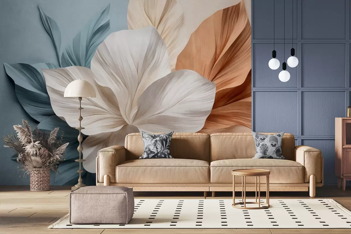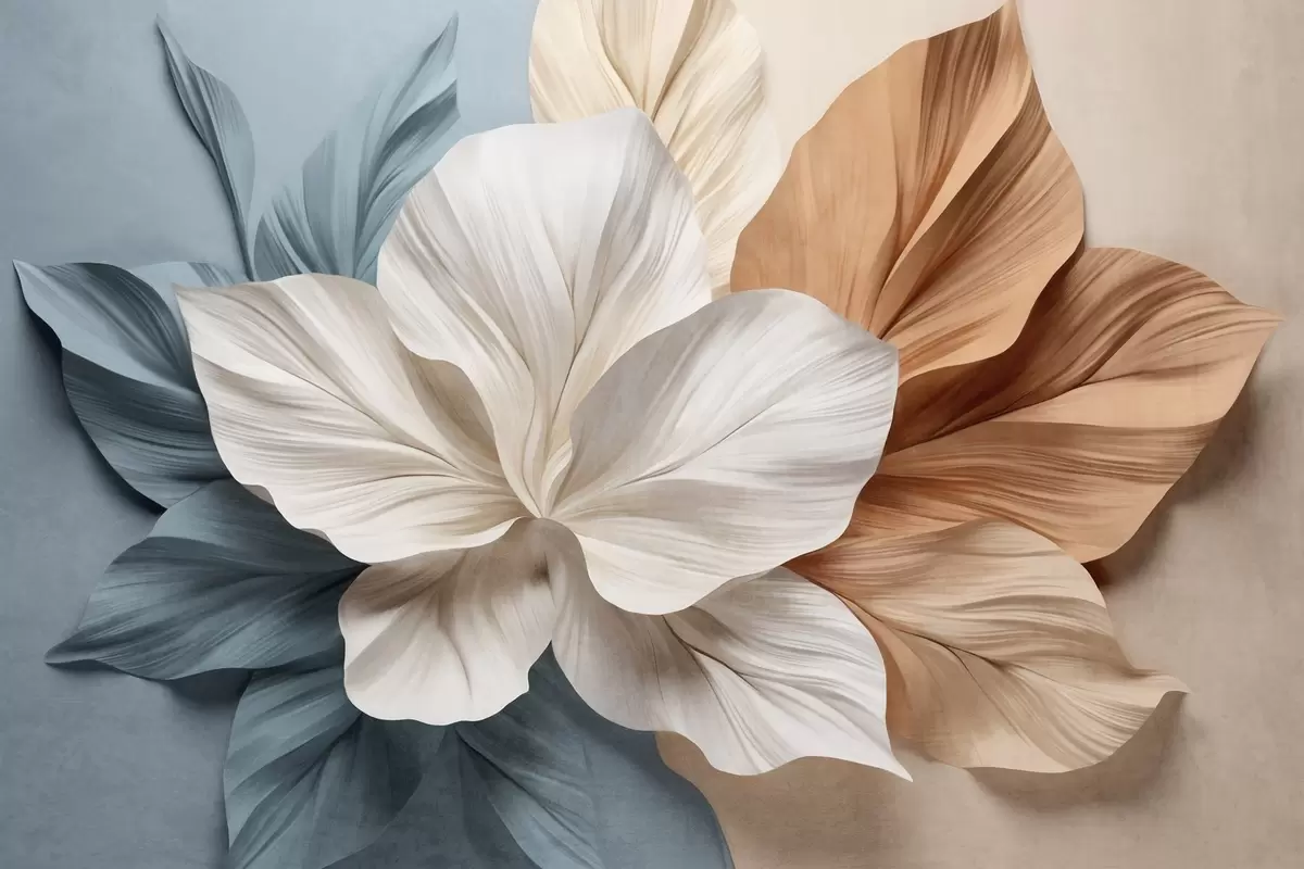 Fototapet Floare abstractă cu mai multe petale și frunze texturate în nuanțe de piersică și albastru, fundal moale Nr. w09604