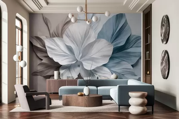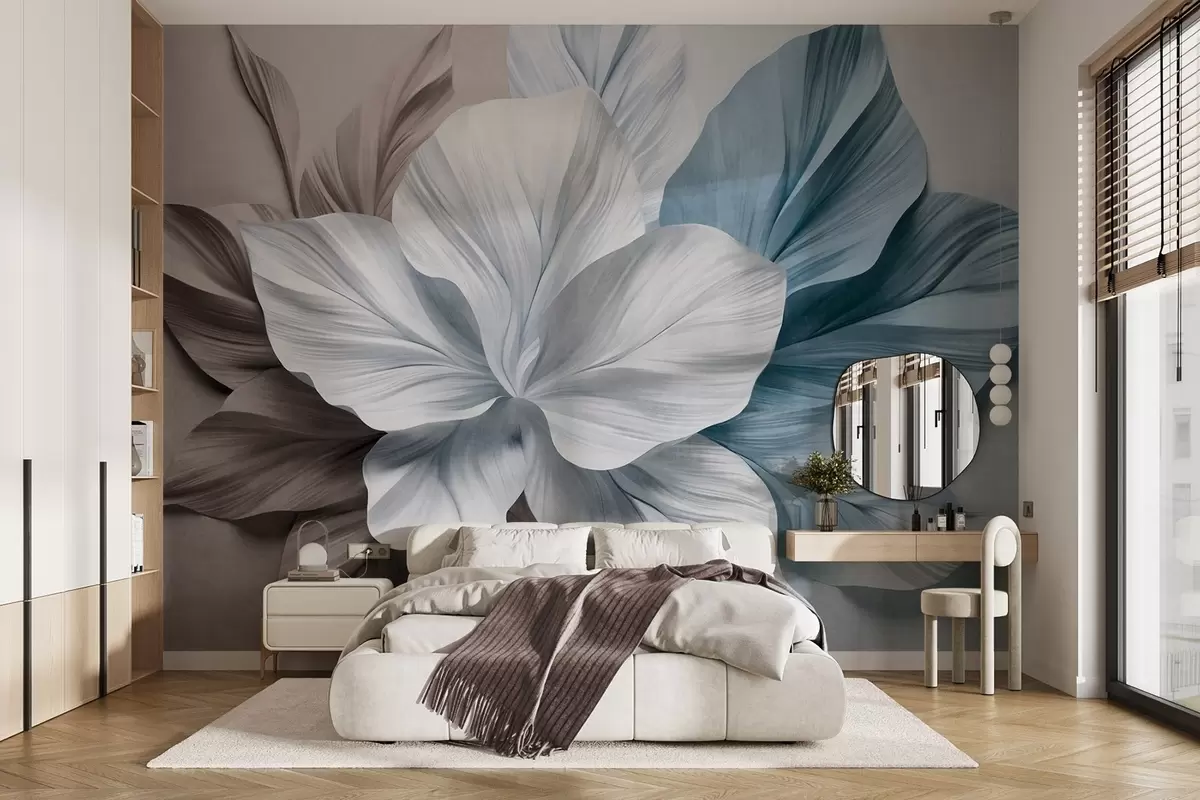 Fototapet Floare abstractă cu mai multe petale și frunze texturate în nuanțe de maro și albastru, fundal moale Nr. w09604v1