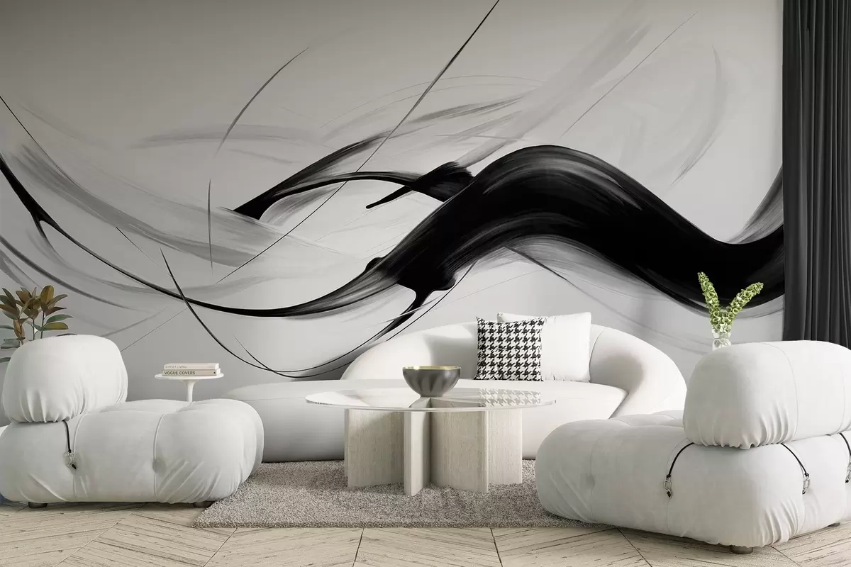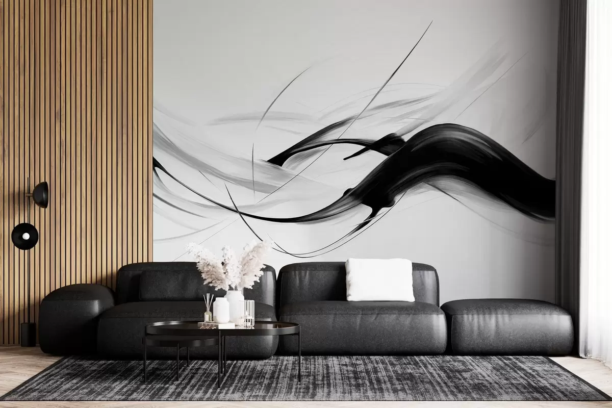 Fototapet Pensule abstracte alb-negru cu linii subțiri, creând un design modern pe fundal deschis. Nr. w09605