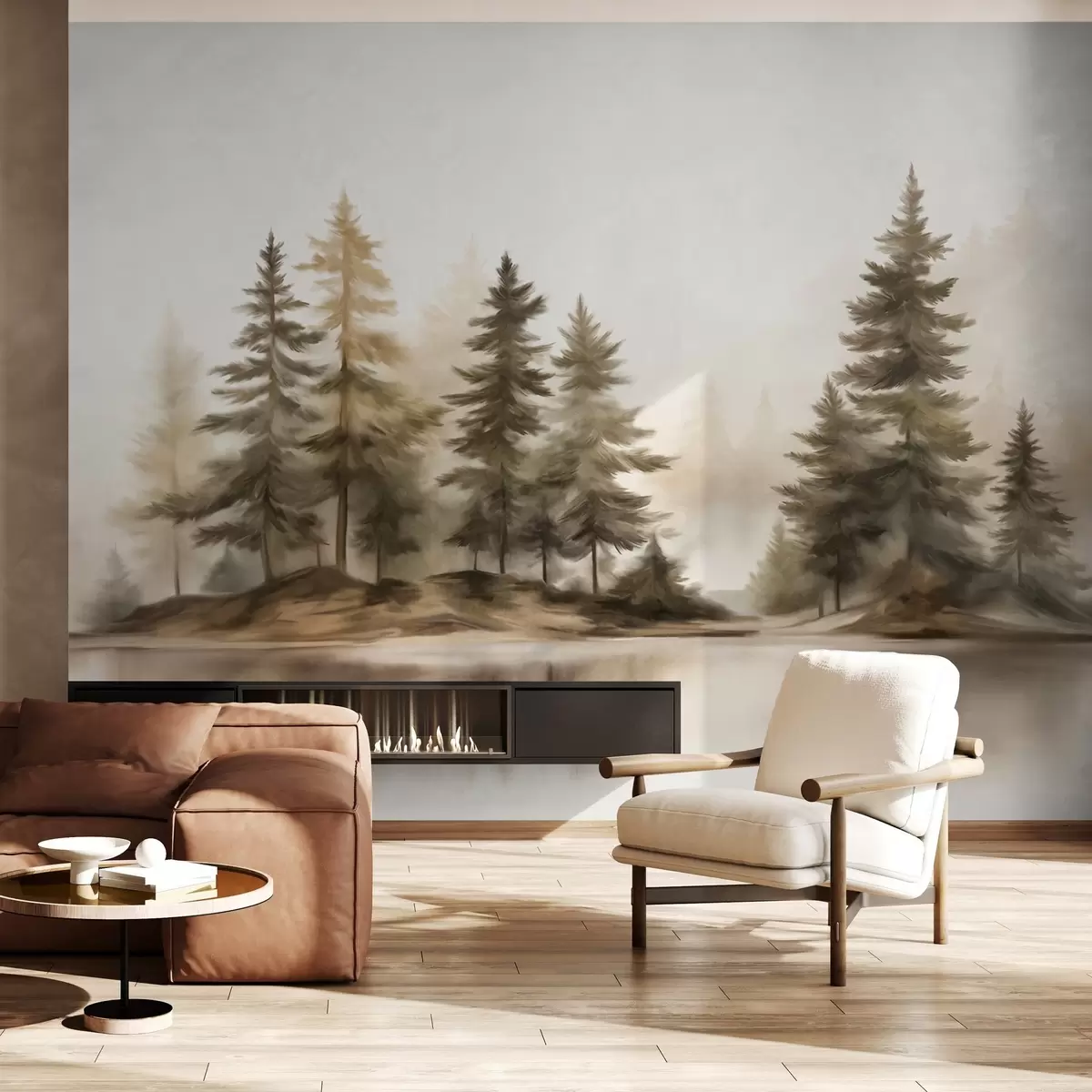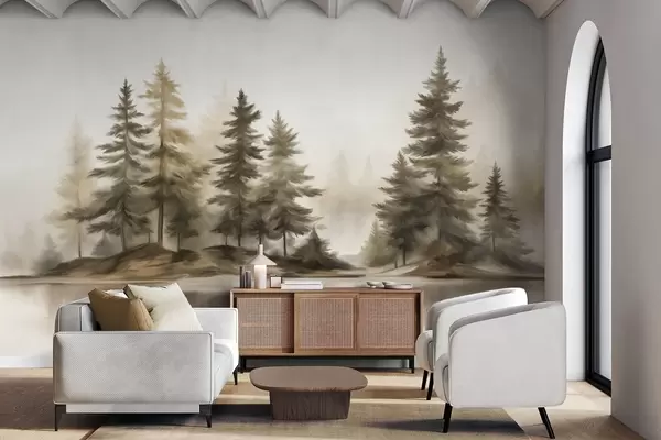 Fototapet O pădure încețoșată, cu textură, cu pini înalți, pictată în stil imitație Nr. w09610