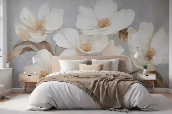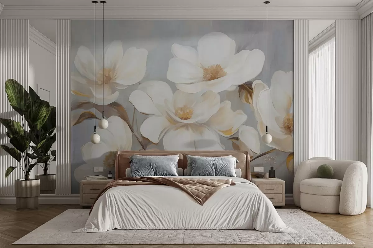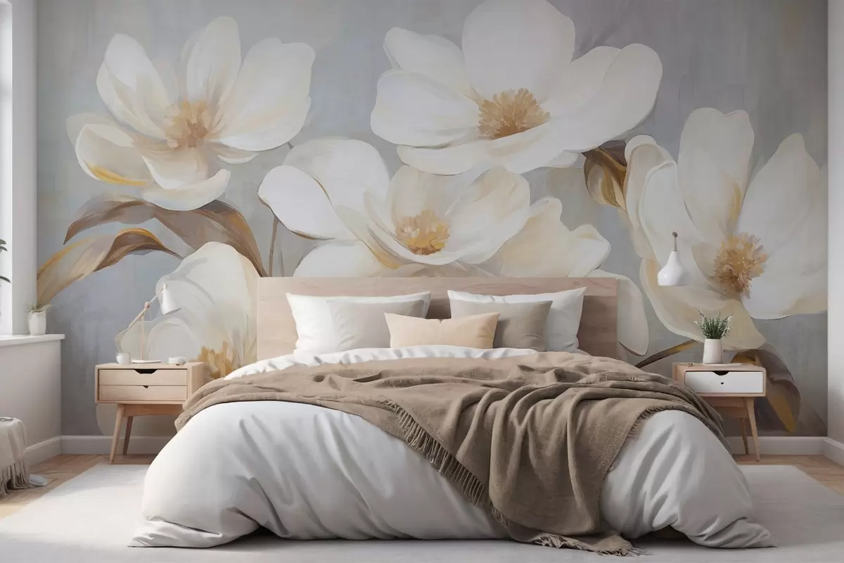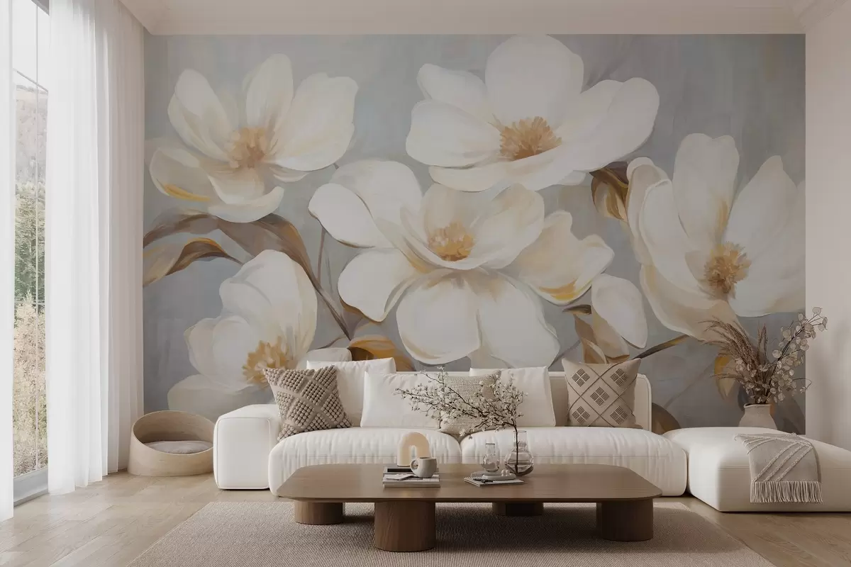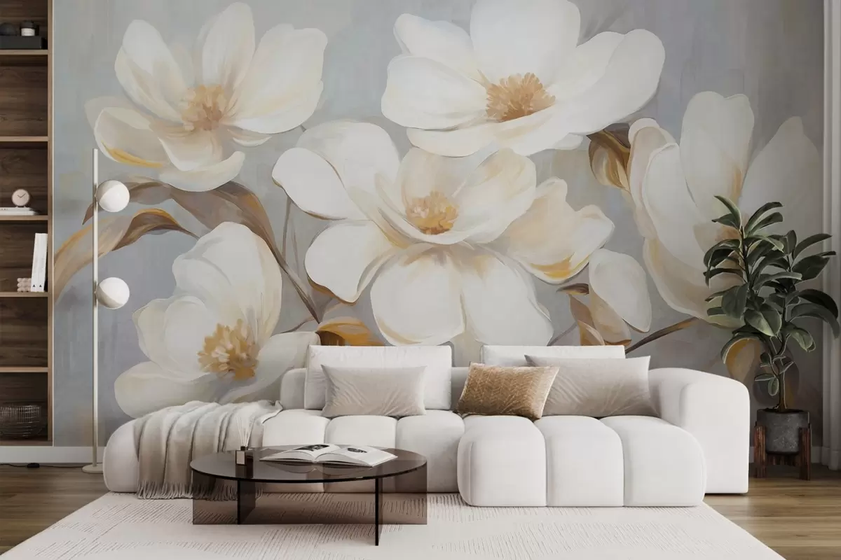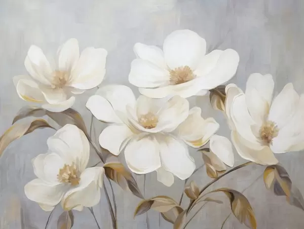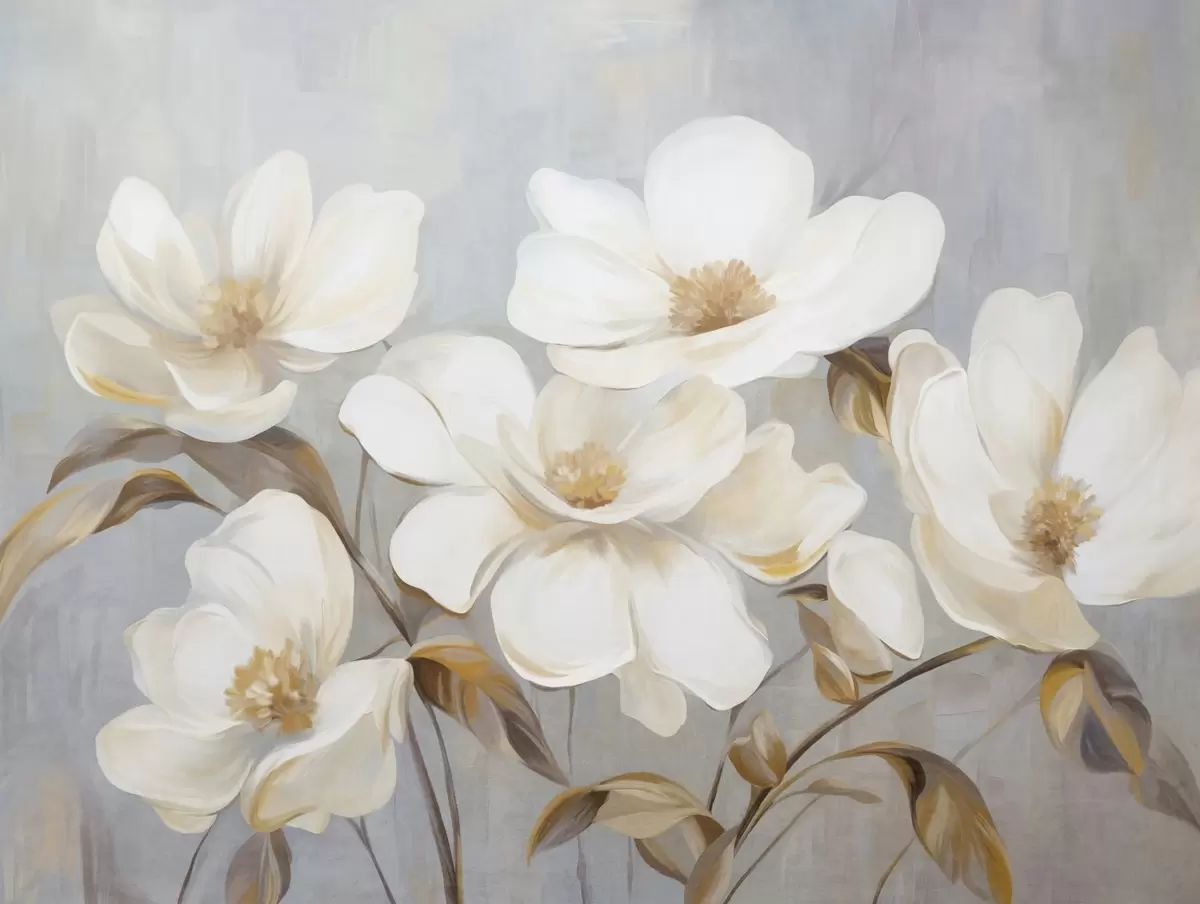 Fototapet O pictură texturată care imită mai multe flori albe de magnolie pe un fundal pastelat discret. Nr. w09612