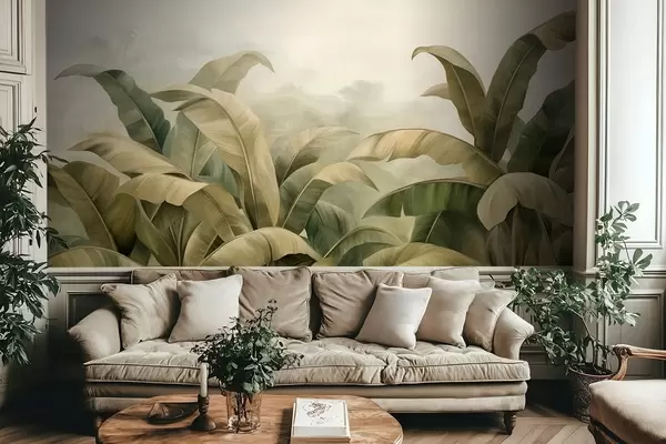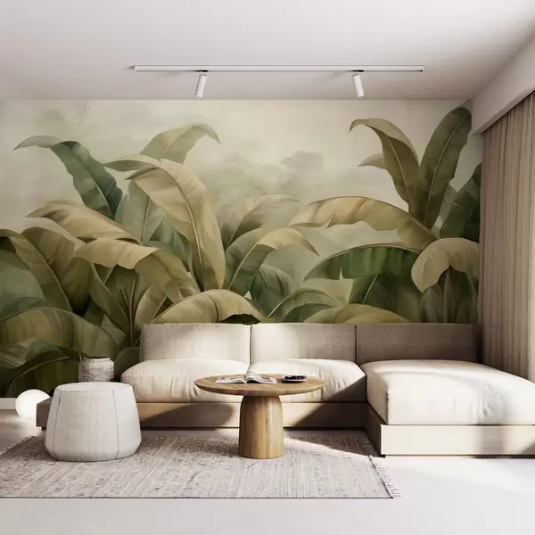 Fototapet Peisaj dens și texturat de junglă, cu frunze mari de bananier în nuanțe discrete de verde și bej Nr. w09613