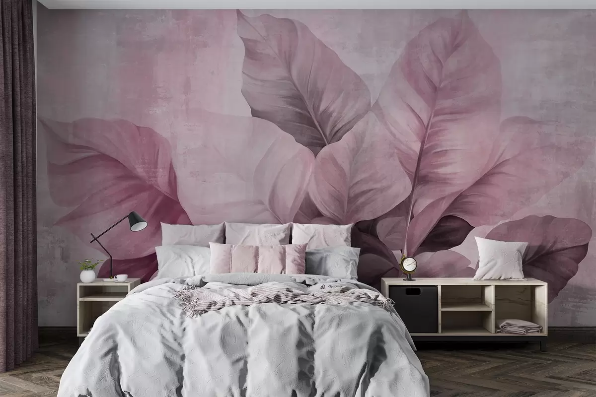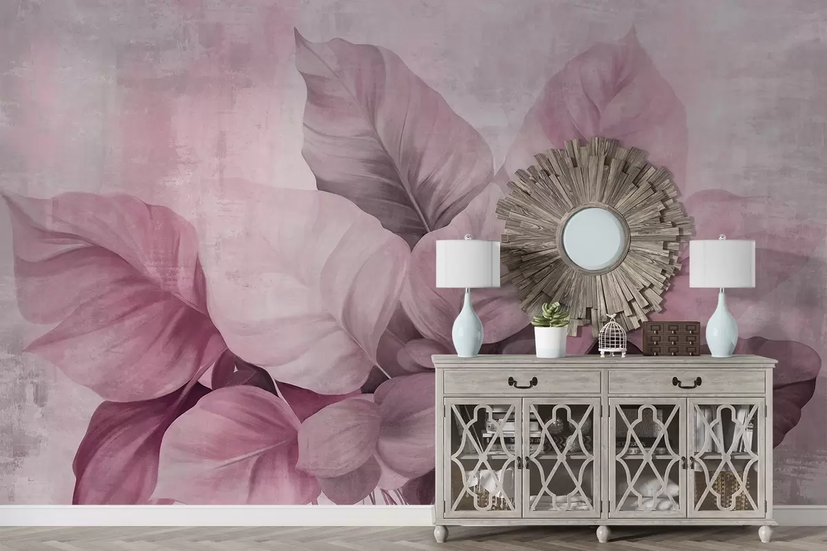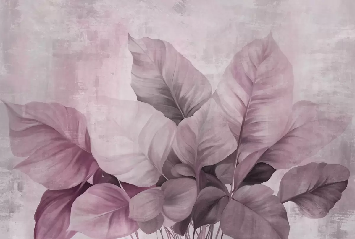 Fototapet Pictură texturată imitând frunze mari, de culoare roz deschis, pe un fundal neutru, cu tușe subtile de pensulă. Nr. w09614v1
