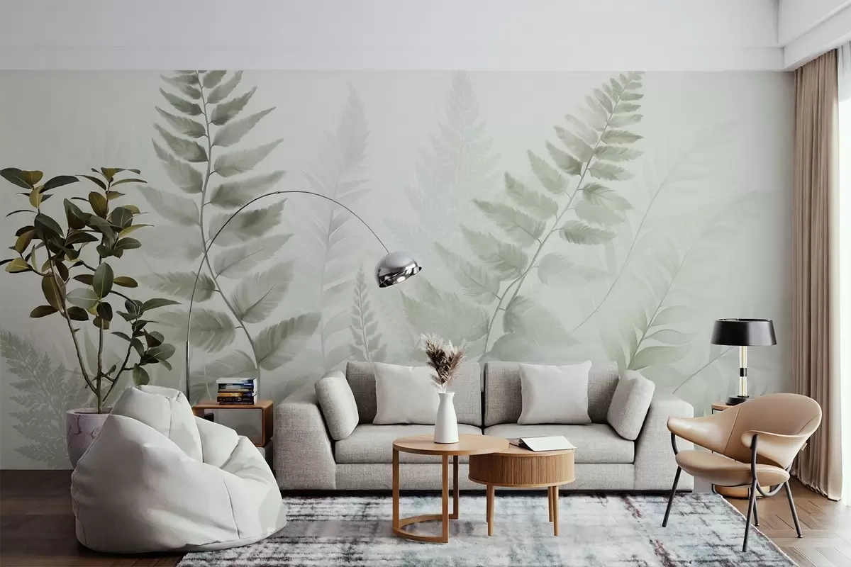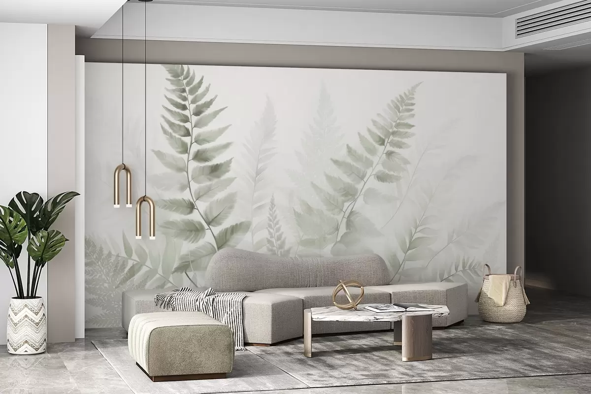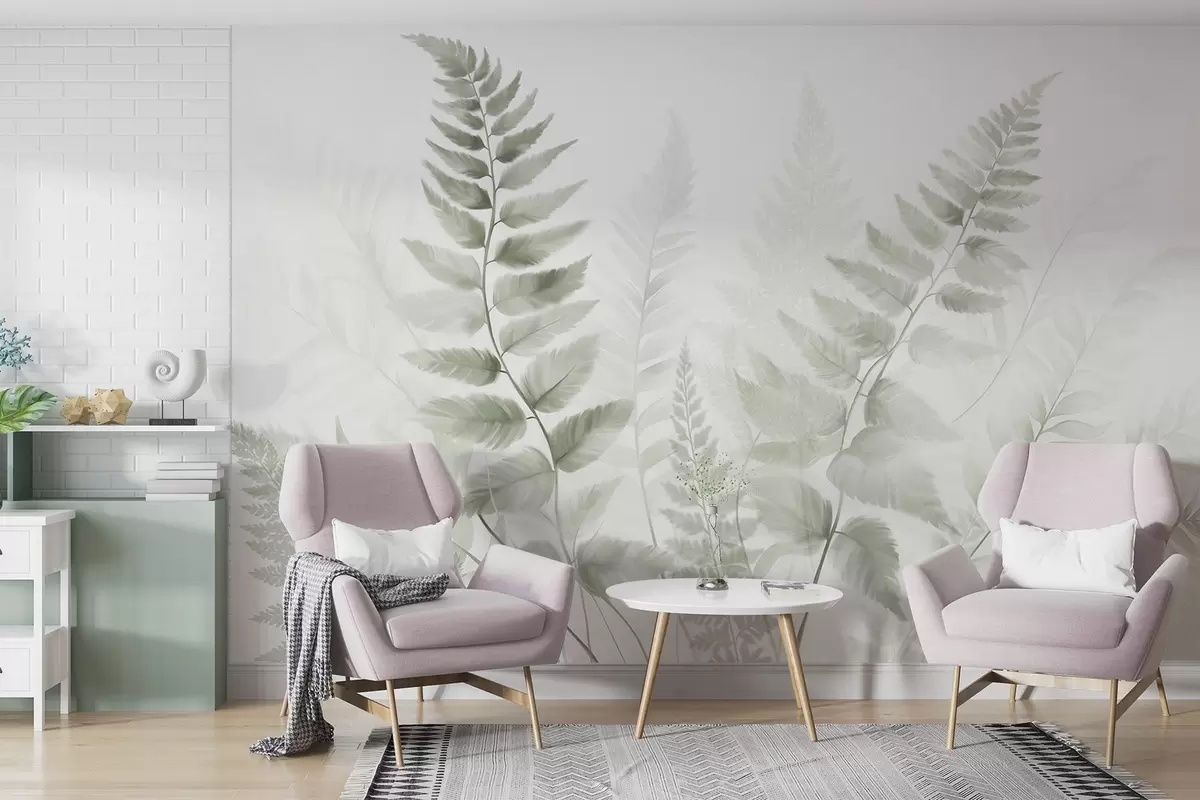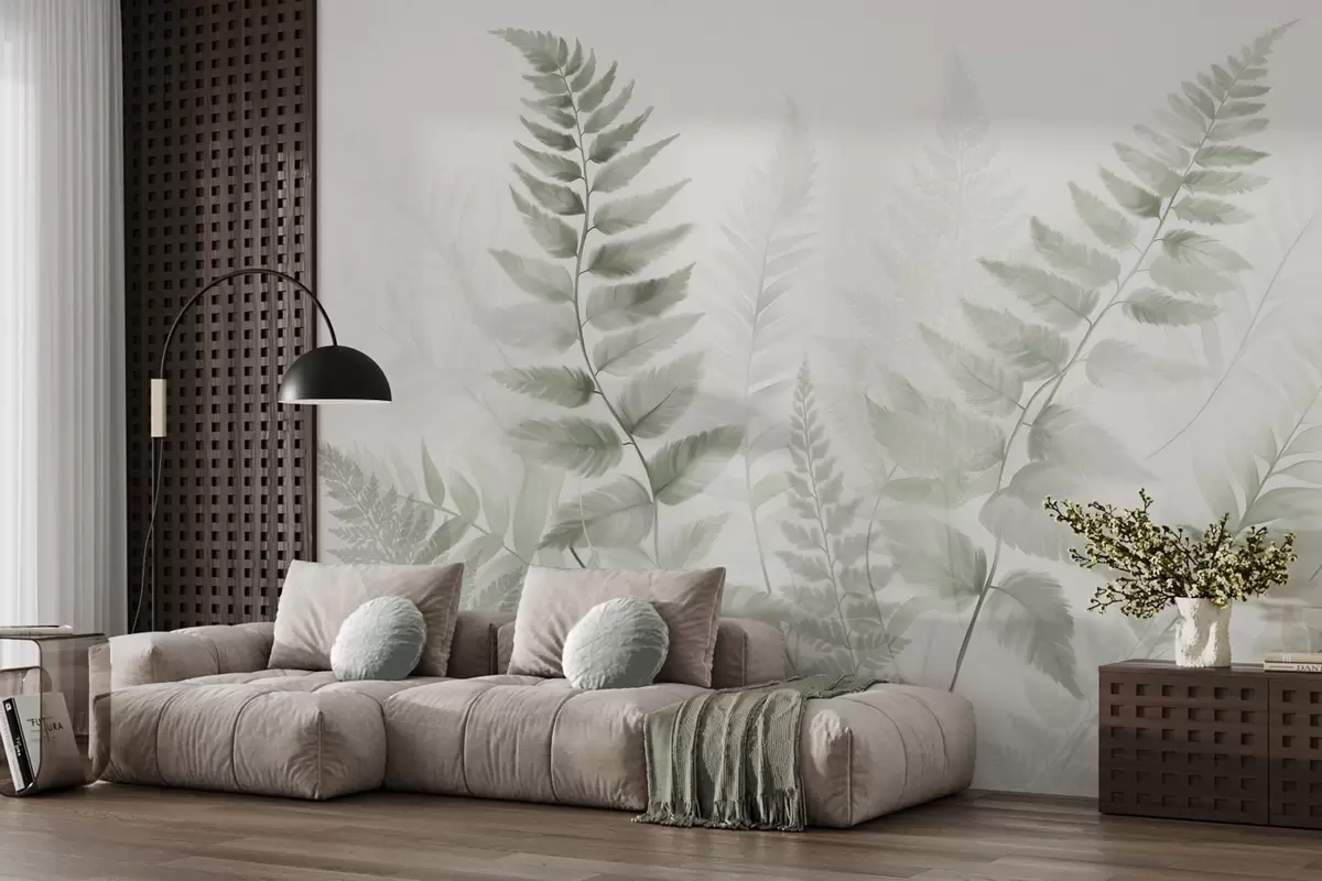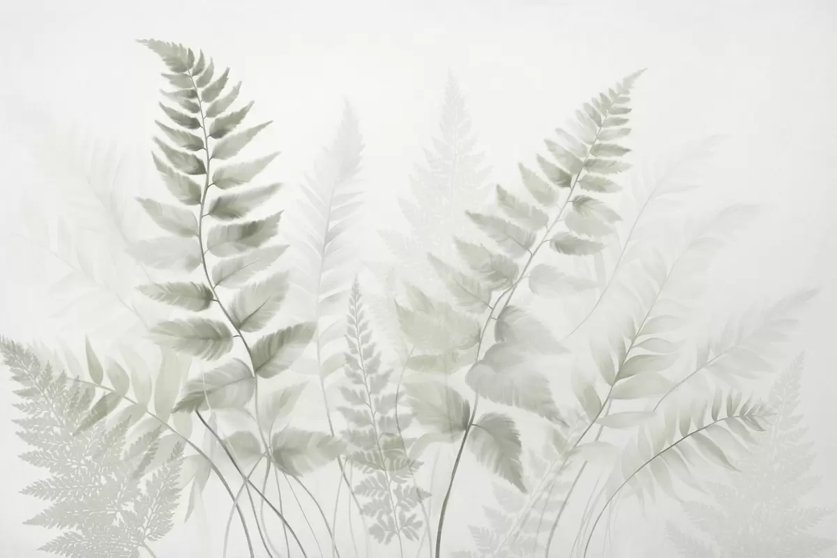 Fototapet Frunze de ferigă uscate, texturate, în diferite nuanțe de verde, pe un fundal moale și deschis, în stil acuarelă. Nr. w09615v1