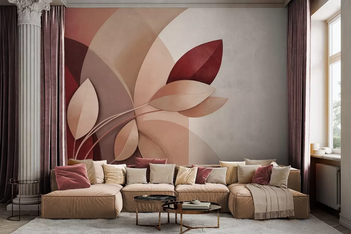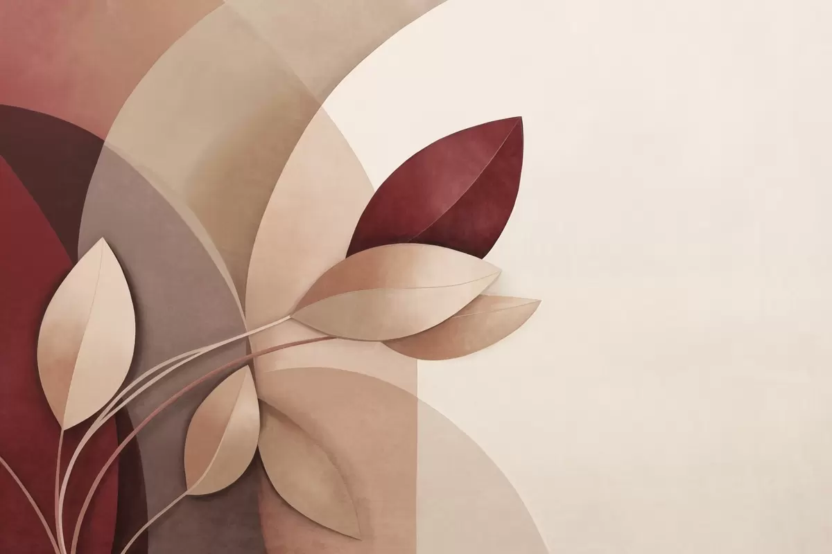 Fototapet Ramură abstractă texturată cu frunze în nuanțe de maro, bej și roșu, pe un fundal de forme abstracte Nr. w09618