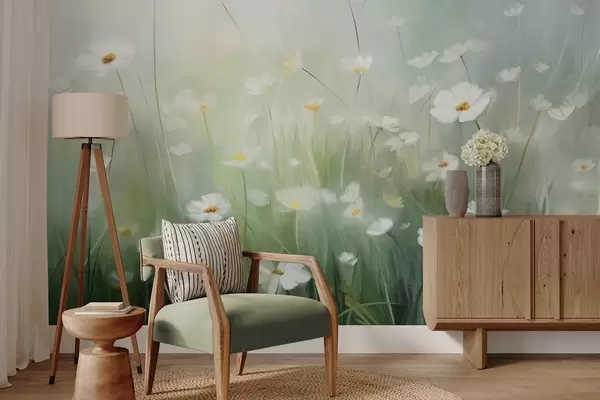 Fototapet Câmp abstract de margarete albe cu iarbă verde și un fundal moale, încețoșat, în stil pictural Nr. w09619