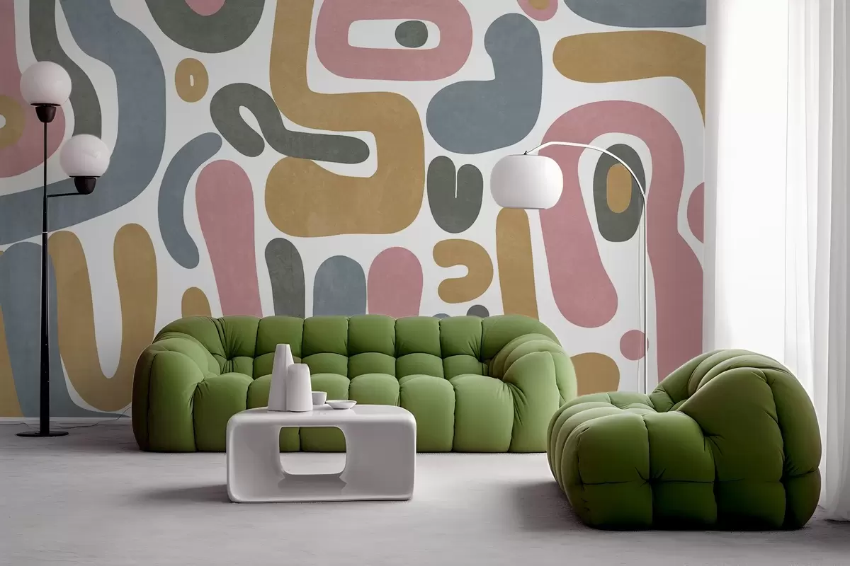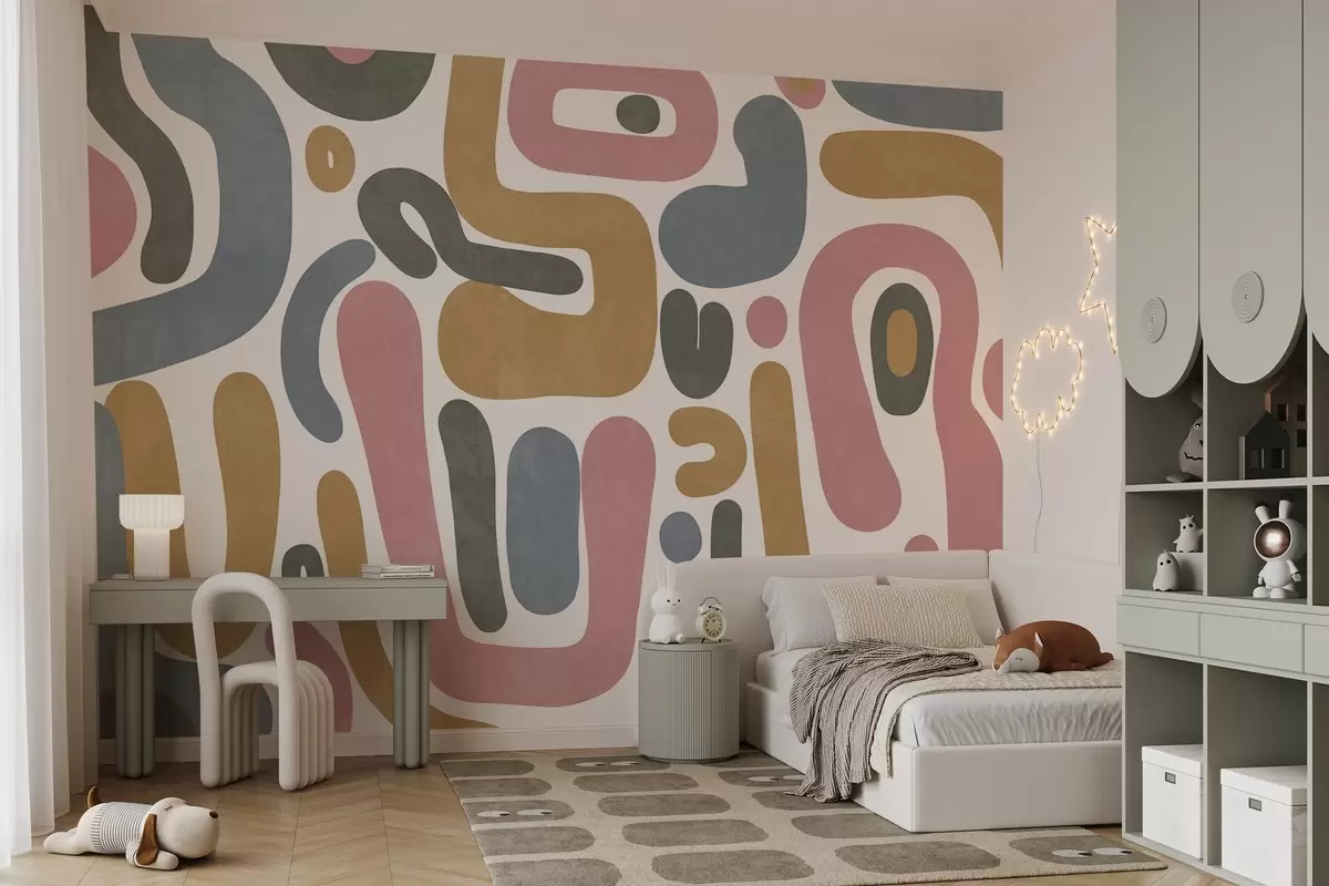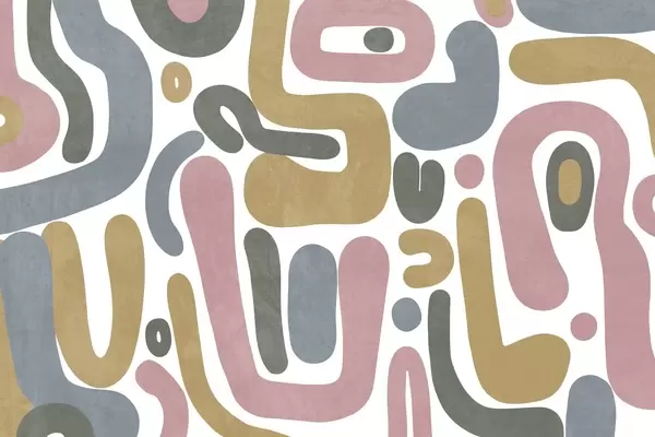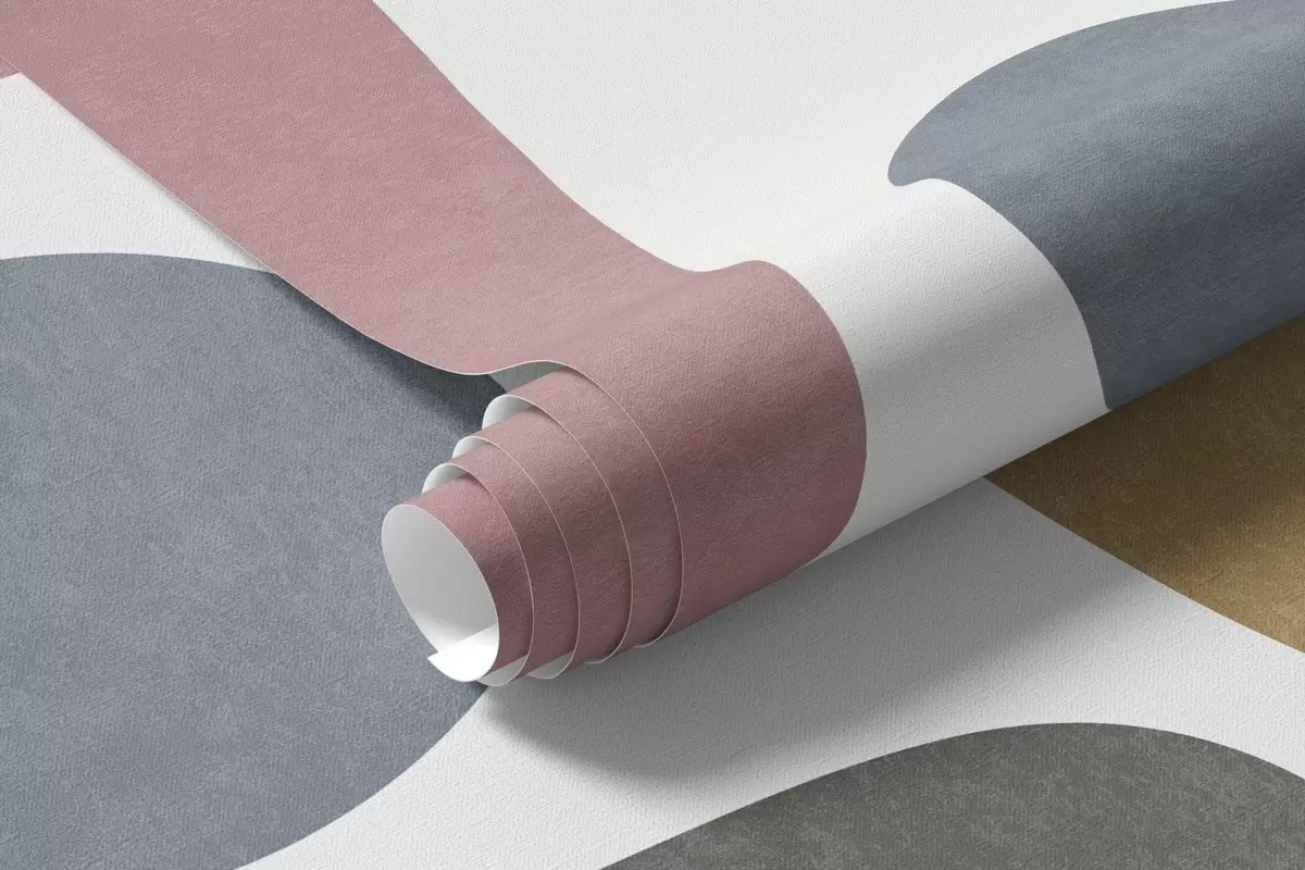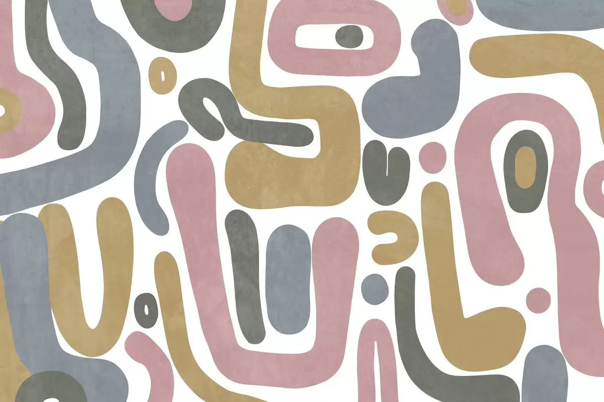 Fototapet Forme abstracte texturate în roz pastel, albastru discret, galben muștar și gri pe fond alb artă modernă Nr. w09620