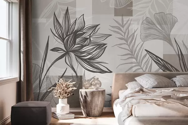 Fototapet Flori și frunze stilizate texturate în nuanțe de maro și bej, cu fundal geometric, artă liniară Nr. w09629