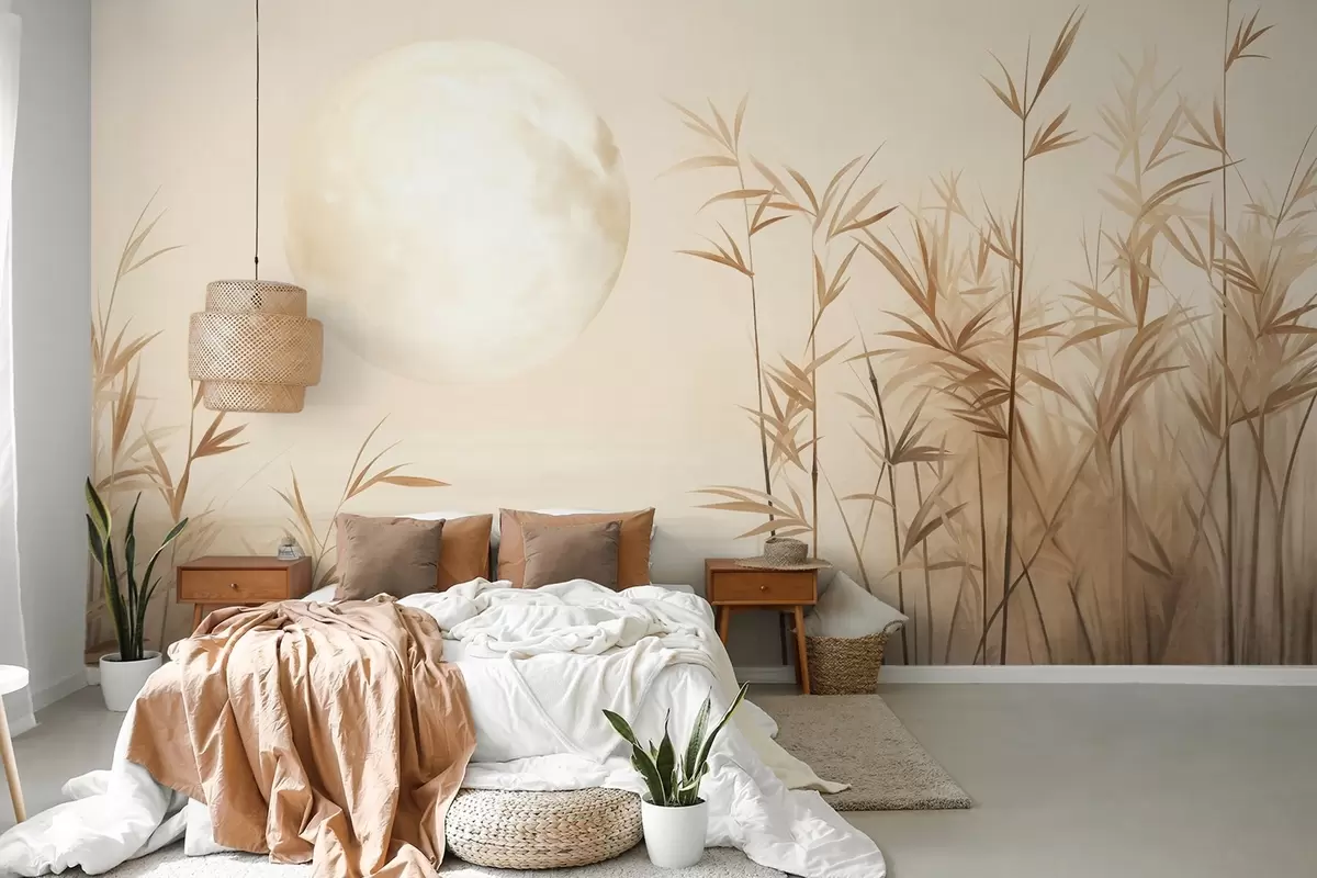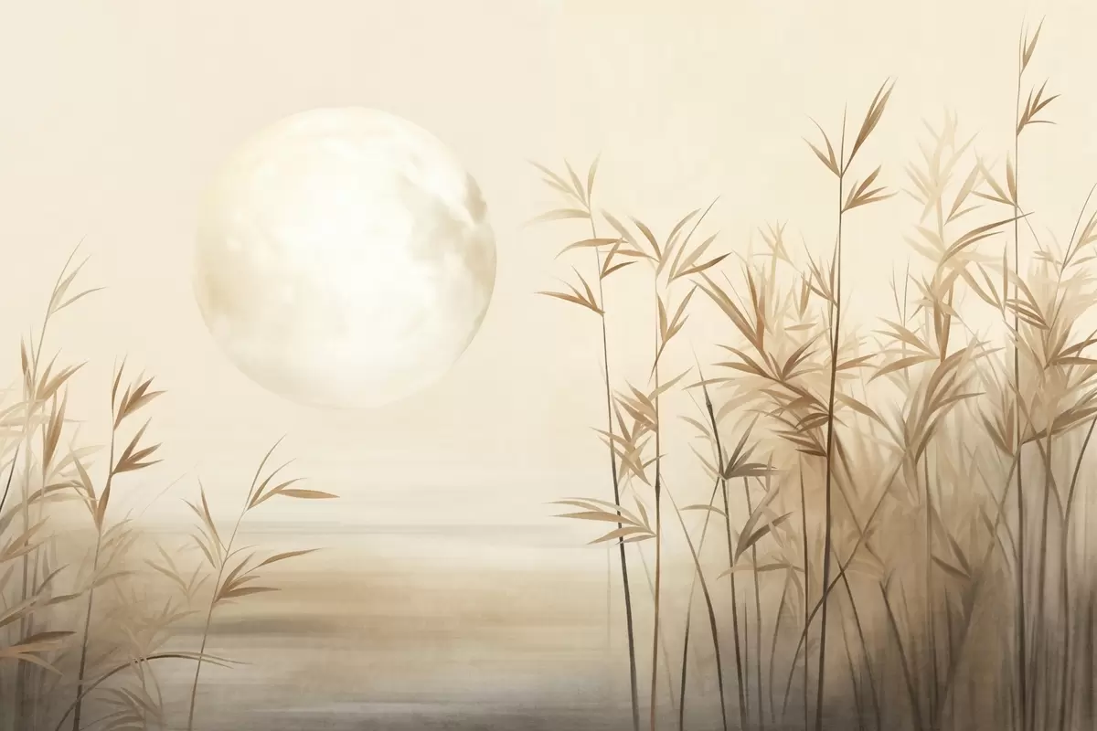 Fototapet Peisaj texturat cu stuf înalt, lac și lună palidă pe un cer încețoșat Nr. w09631