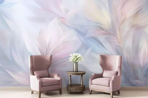 Fototapet Frunze moi, în culori pastelate, și pene în nuanțe de roz, albastru și galben, imprimeu abstract și texturat Nr. w09634