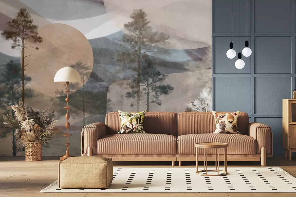 Fototapet Pini înalți într-un peisaj texturat, cu forme circulare abstracte și munți stratificați în tonuri pământii Nr. w09636