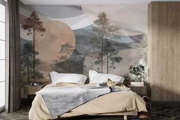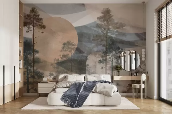 Fototapet Pini înalți într-un peisaj texturat, cu forme circulare abstracte și munți stratificați în tonuri pământii Nr. w09636