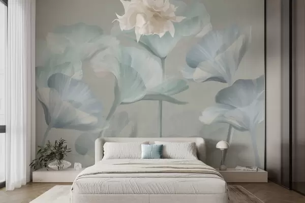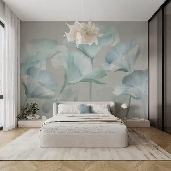 Fototapet Flori de lotus translucide, de culoare turcoaz pal, cu textură și petale delicate, pe un fundal gri discret Nr. w09640v2