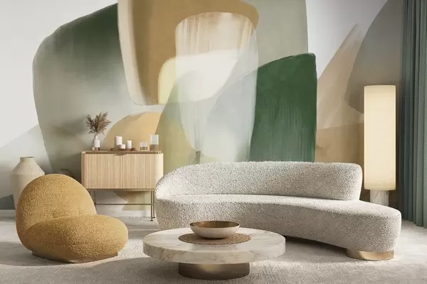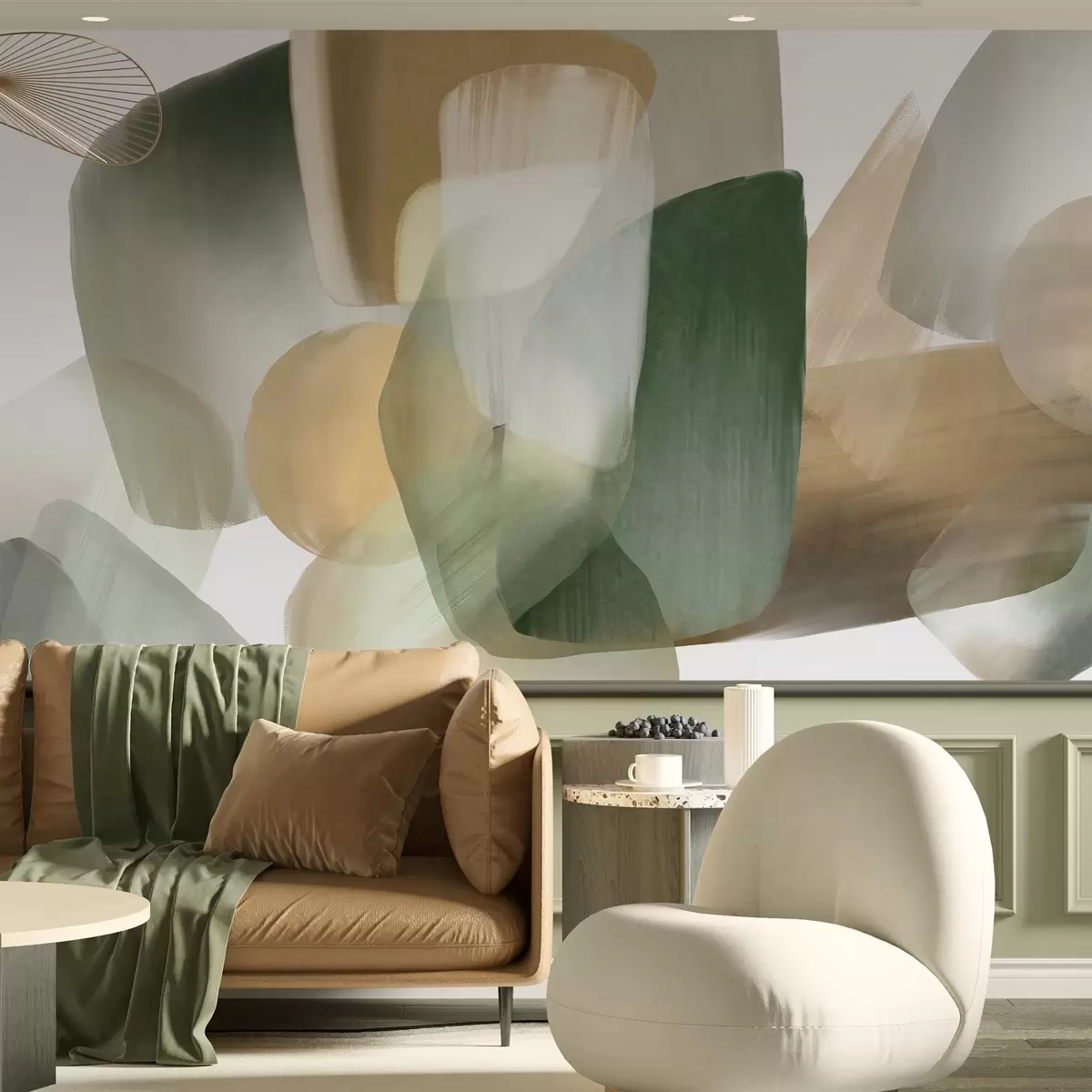 Fototapet Forme abstracte texturate în culori discrete de verde și bej, cu margini moi și straturi suprapuse Nr. w09642