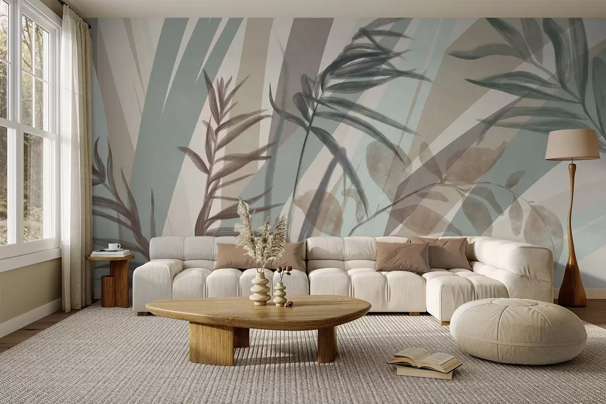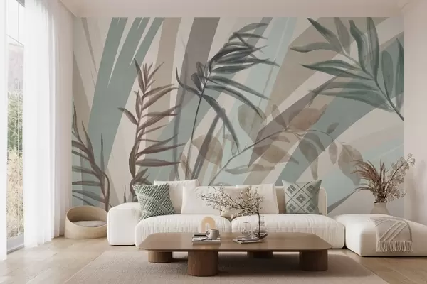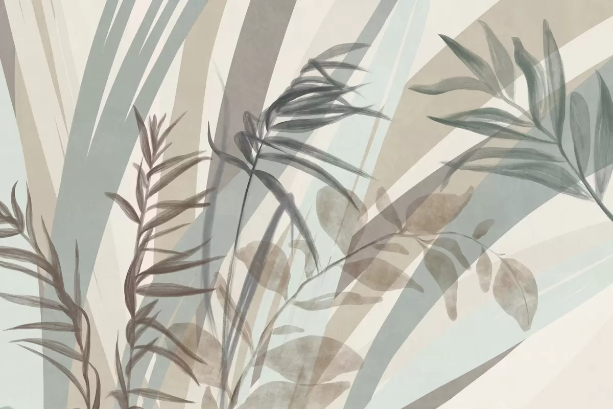 Fototapet Iarbă înaltă și frunze texturate în nuanțe discrete de pământ, cu linii abstracte în fundal, creând un imprimeu organic. Nr. w09643