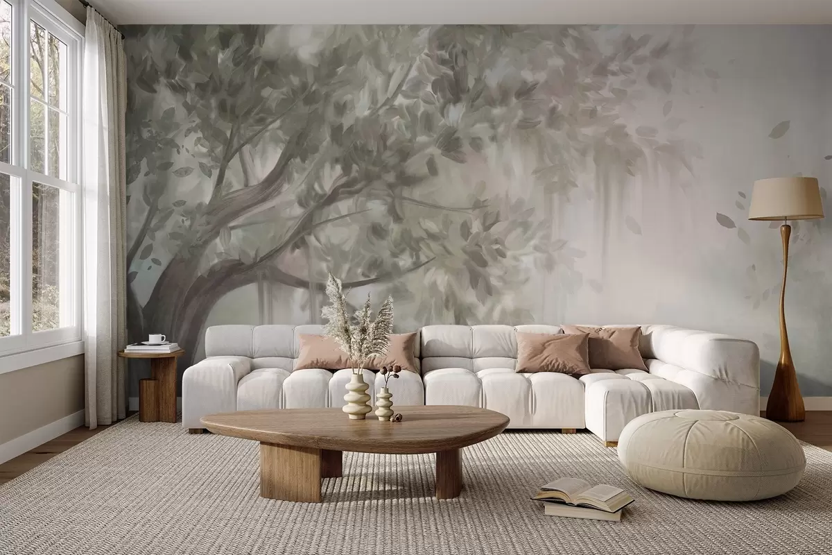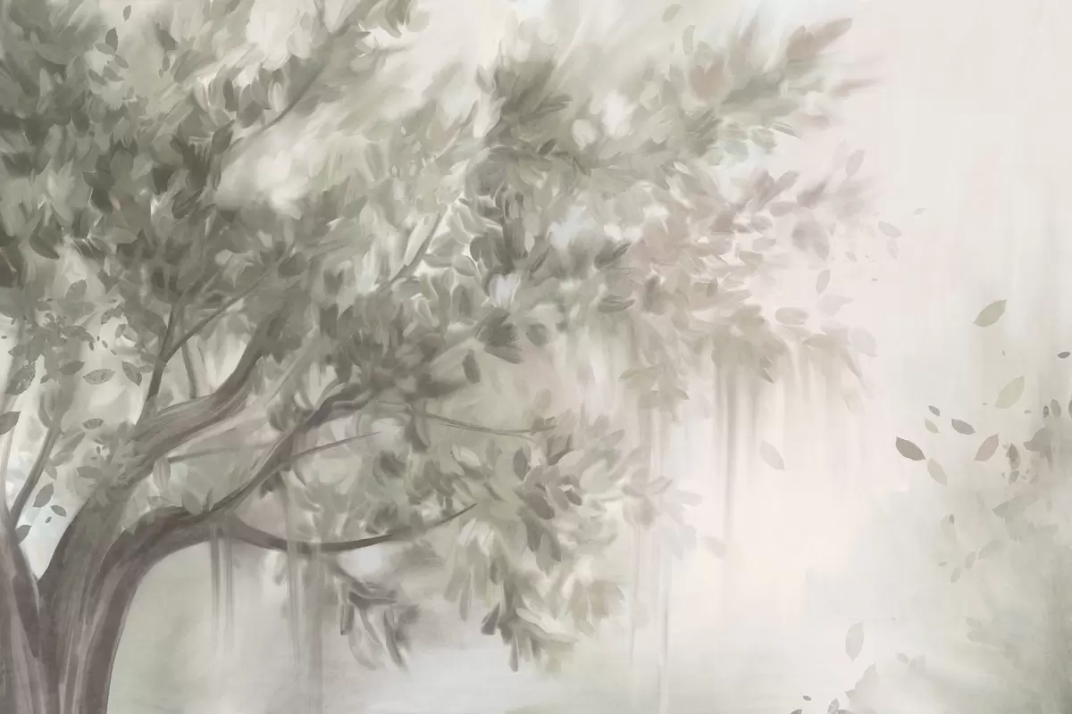 Fototapet Copac texturat cu frunze și ramuri de culoare verde deschis, cu un fundal moale și încețoșat Nr. w09650