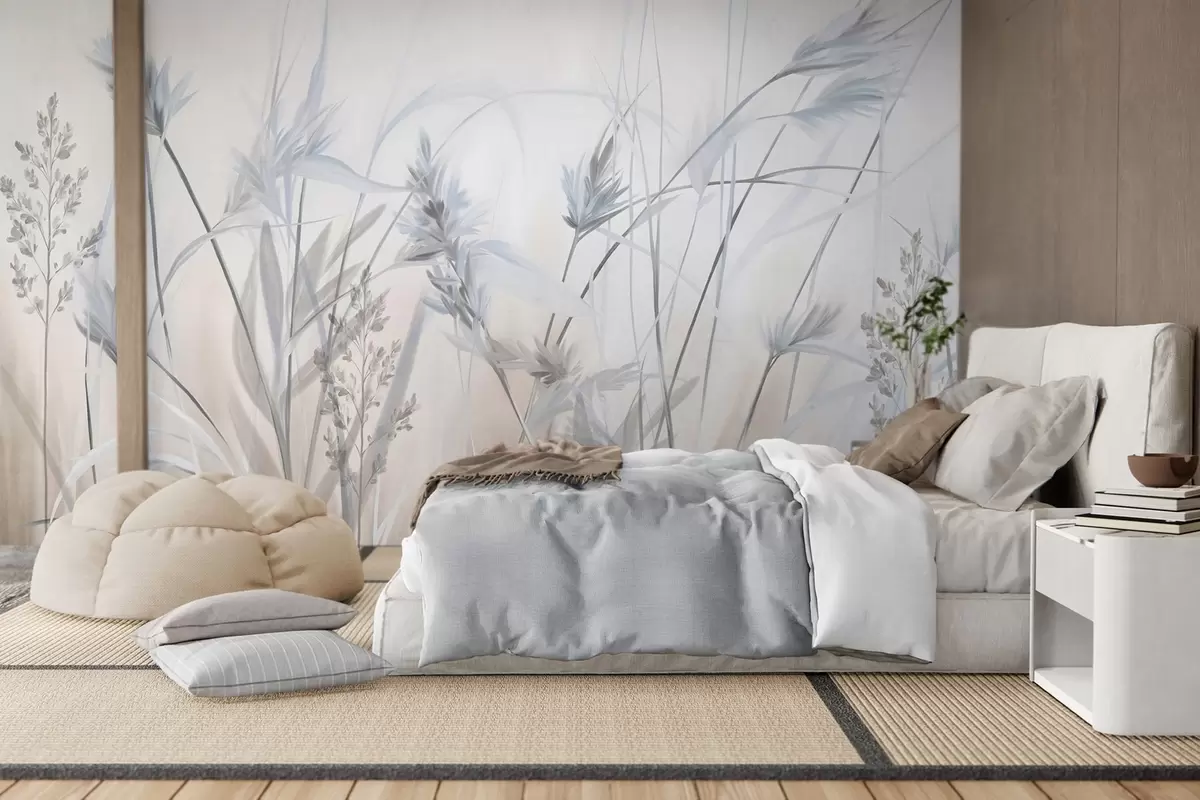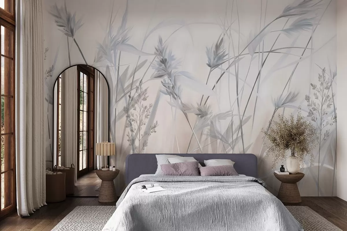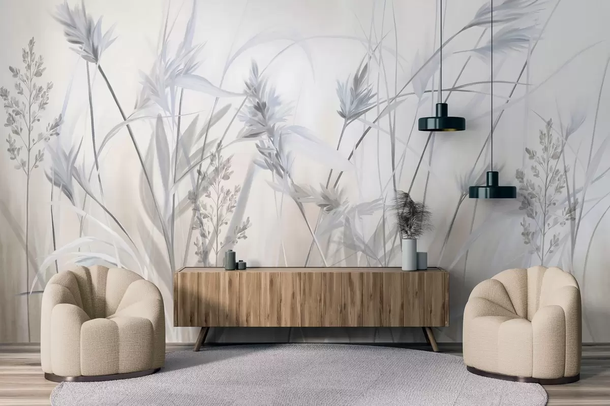 Fototapet Tulpini înalte și uscate de iarbă, cu vârfuri pufoase în nuanțe discrete, pe un fundal alb și bej, moale și încețoșat. Nr. w09652v1