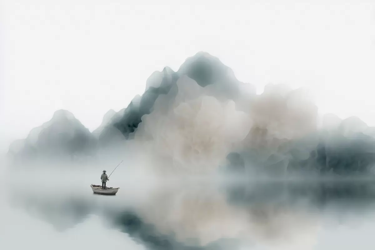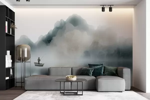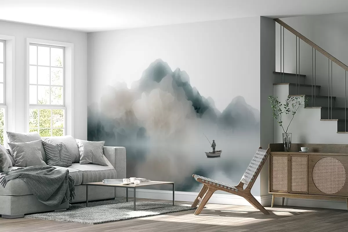Fototapet Peisaj montan cu o barcă și un pescar care se pierd în ceața ușoară Nr. w09678