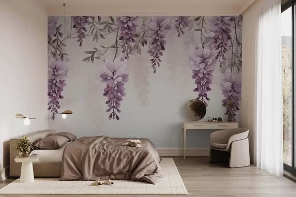 Fototapet Ramuri delicate și mari de lavandă atârnate pe perete, imitație de acuarelă Nr. w09690