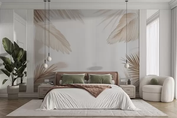 Fototapet Decor tropical în nuanțe de bej, cu siluete de frunze de palmier și umbre delicate Nr. w09714