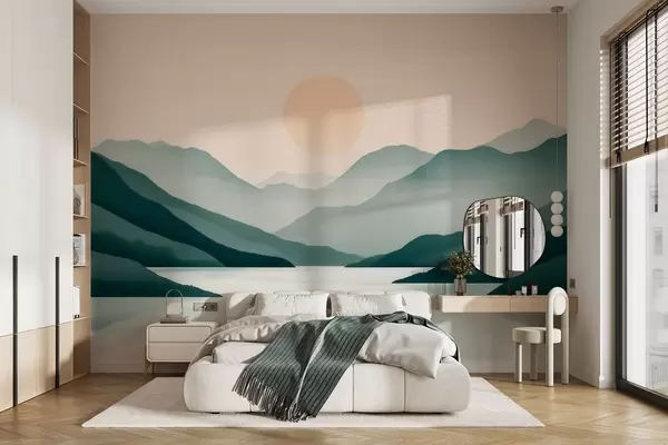 Fototapet Peisaj montan liniștit, cu soarele deasupra lacului Nr. w09735