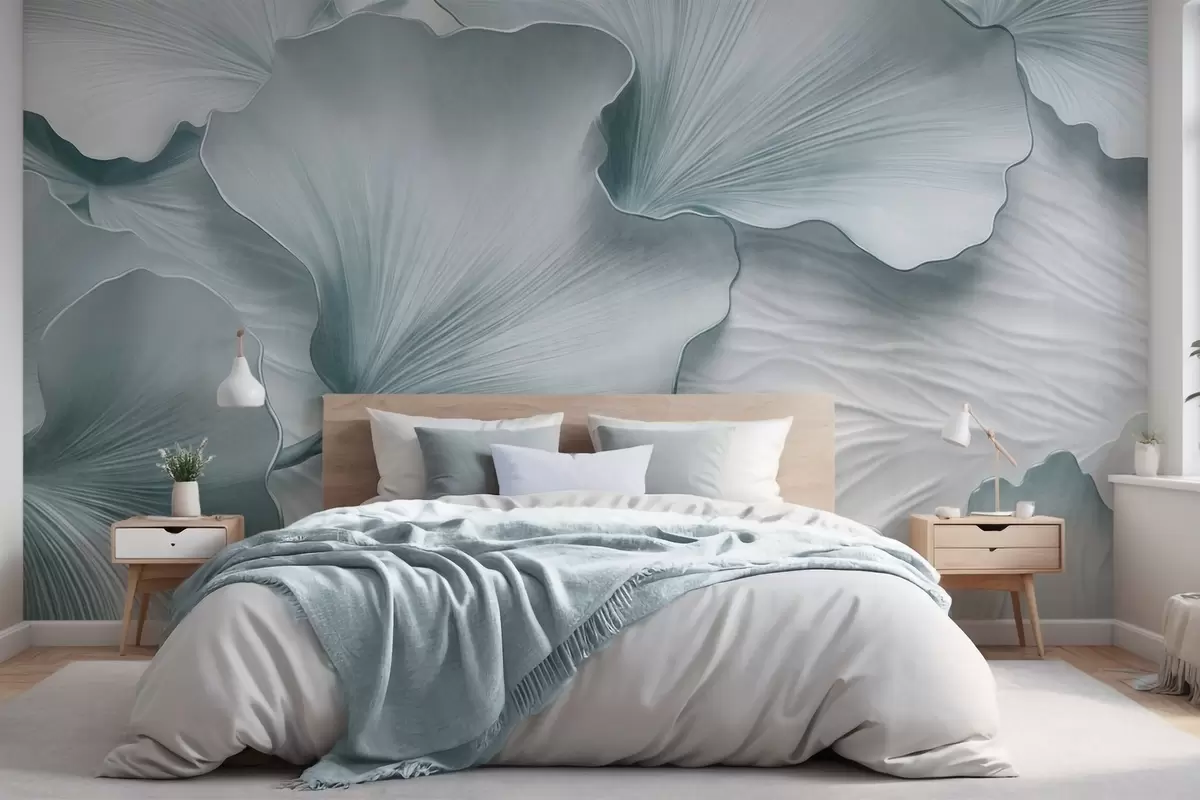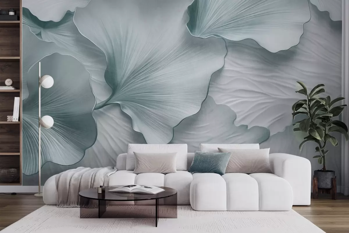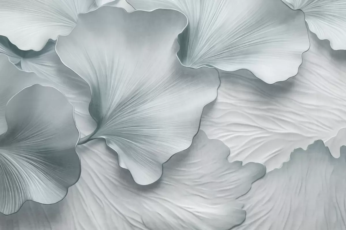 Fototapet Pete texturate, albastre și albe, cu frunze de ginkgo și imprimeu organic delicat Nr. w09741v1