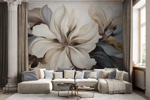 Fototapet Flori mari, cremoase, de magnolie, cu frunze maro și gri, lumină difuză, fundal abstract Nr. w09749