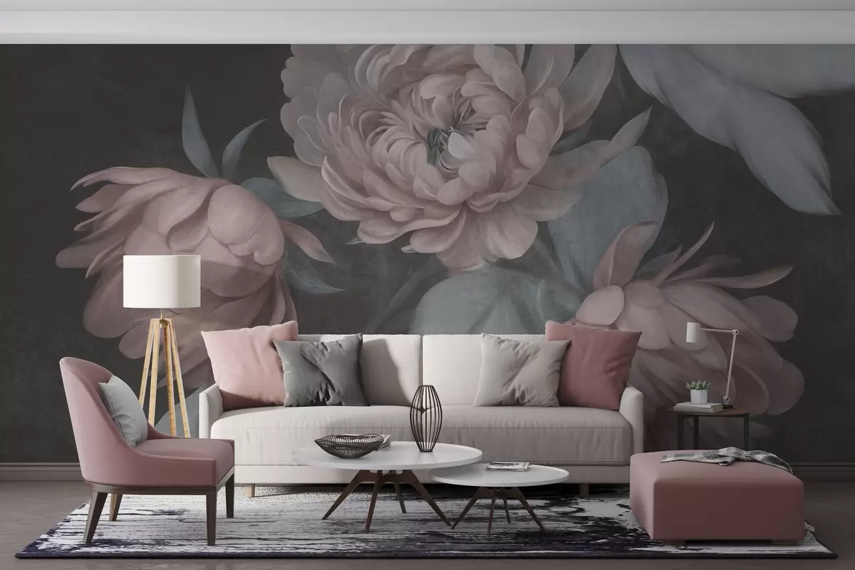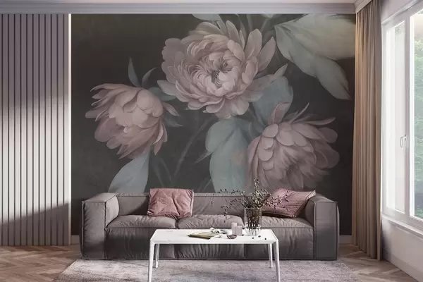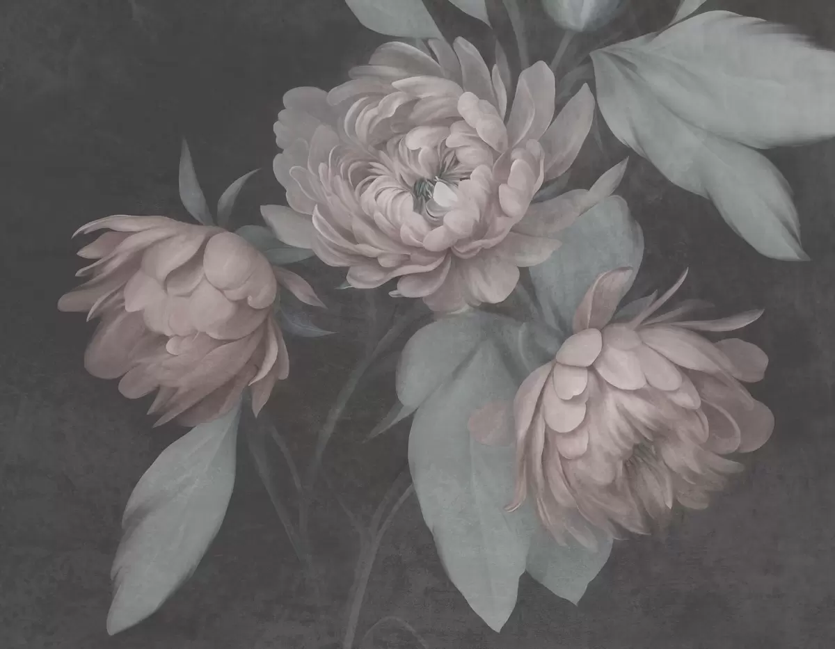 Fototapet Buchete de bujori roz deschis, cu textură, și frunze de un verde discret, pe un fundal întunecat Nr. w09751v1