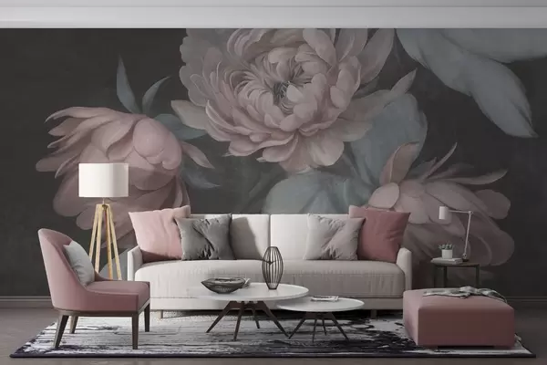 Fototapet Buchete de bujori roz deschis, cu textură, și frunze de un verde discret, pe un fundal întunecat Nr. w09751v1