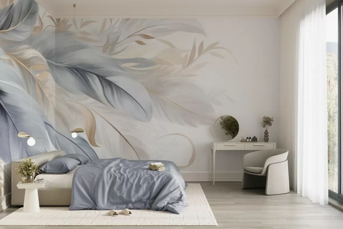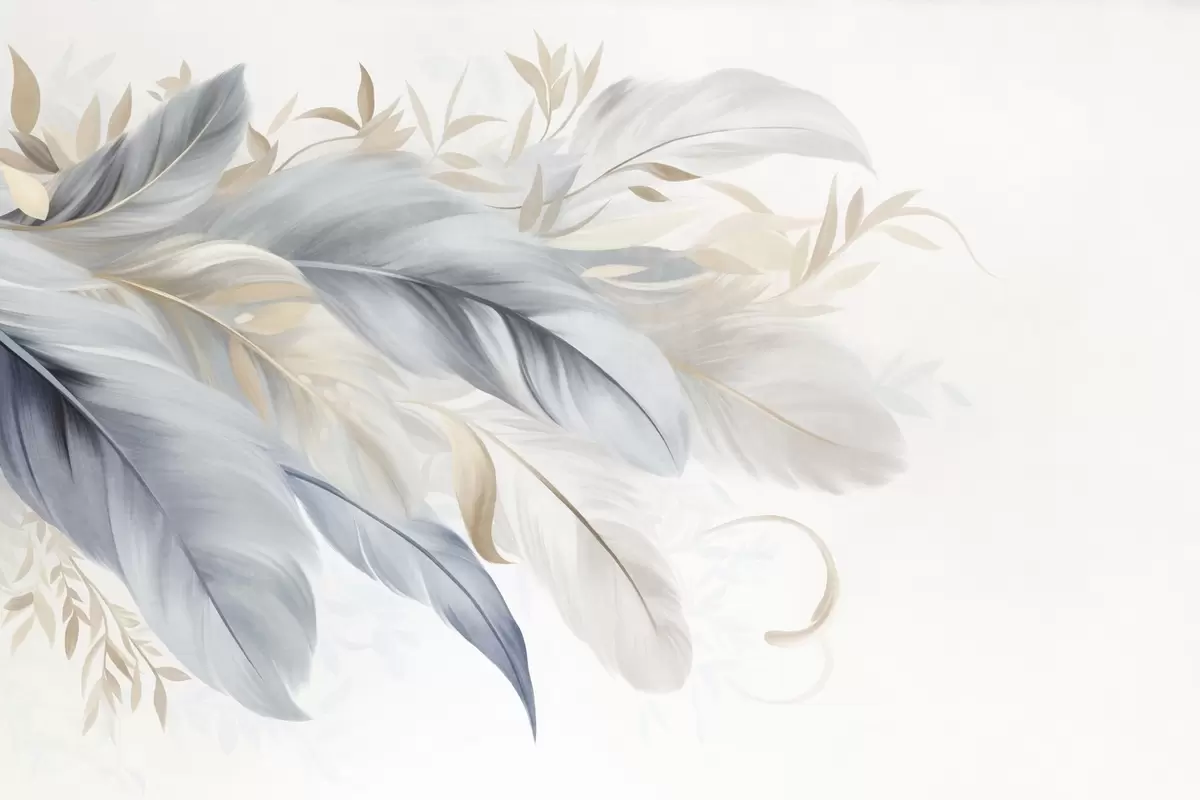 Fototapet Pene texturate în culori pastelate și frunze delicate pe un fundal deschis Nr. w09763