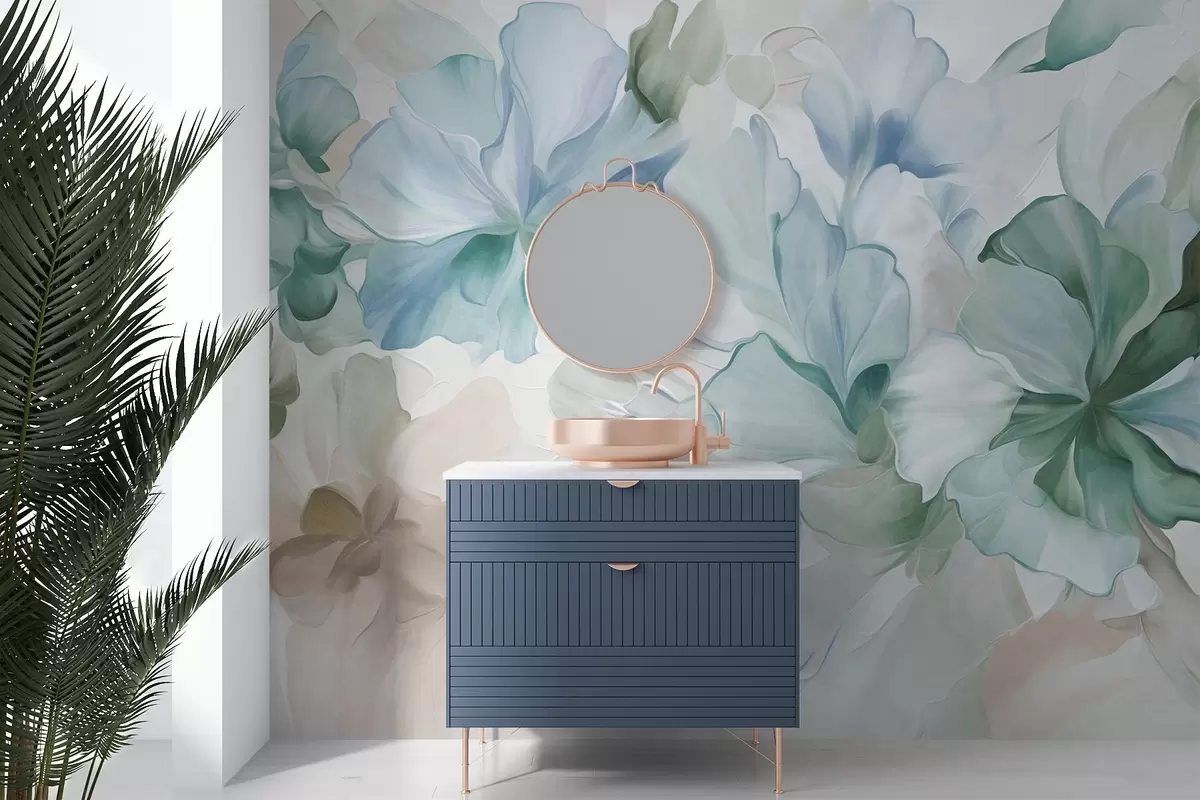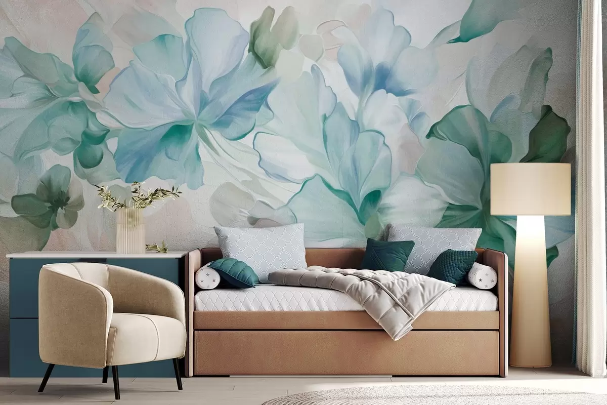 Fototapet Flori abstracte, fanteziste, în nuanțe de verde, albastru și bej, în stil pictural, artă texturată Nr. w09767v1