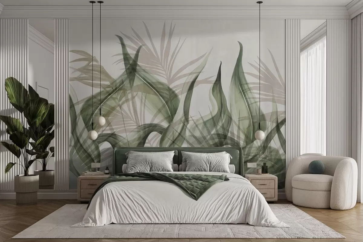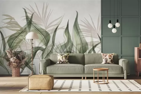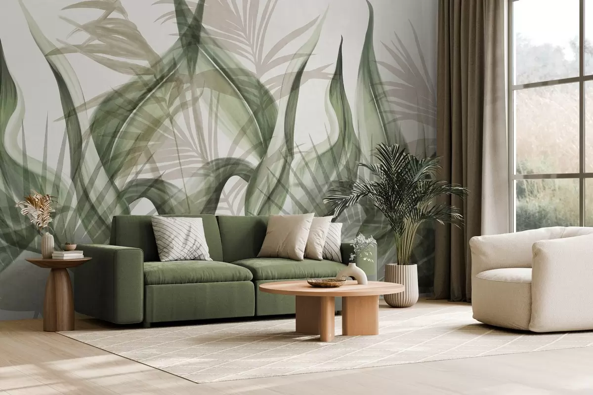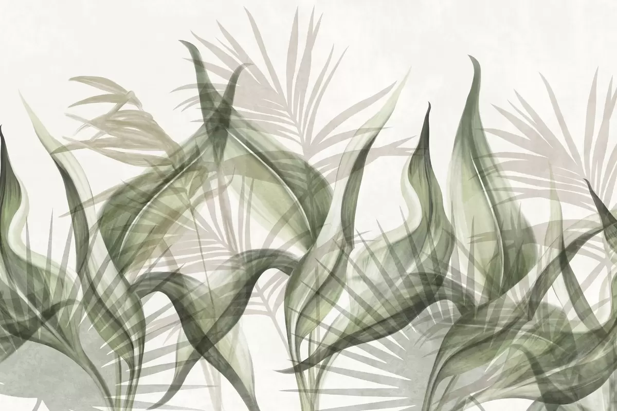 Fototapet Frunze tropicale în nuanțe de bej și verde pe fond alb, în stil acuarelă texturat Nr. w09772v1