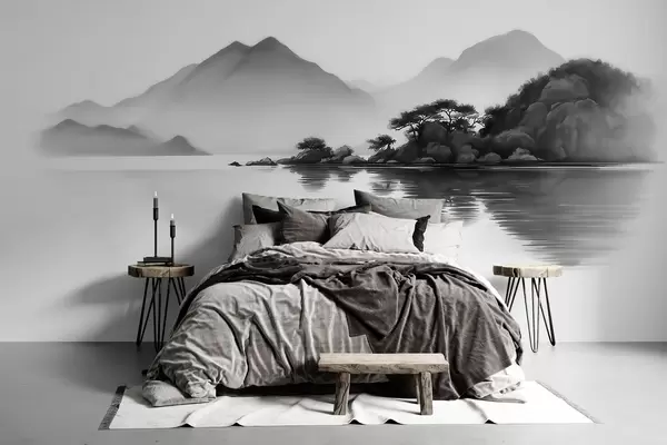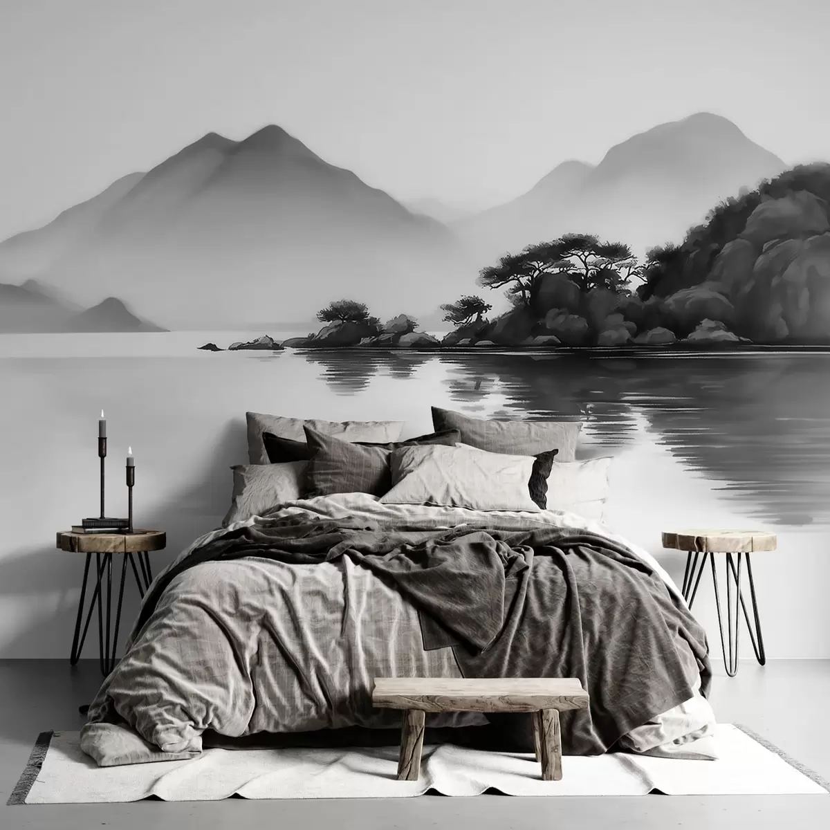 Fototapet Peisaj alb-negru cu munți și un lac învăluit într-o ceață ușoară Nr. w09803