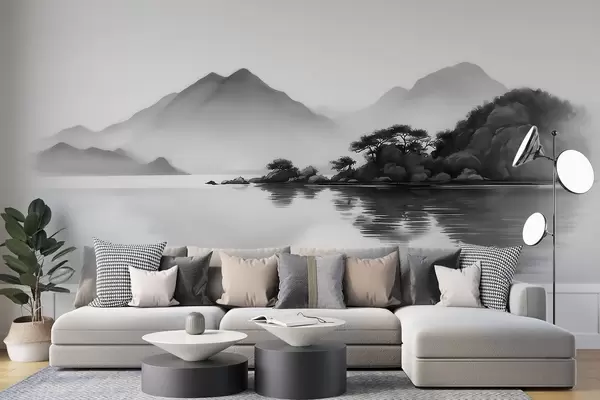 Fototapet Peisaj alb-negru cu munți și un lac învăluit într-o ceață ușoară Nr. w09803