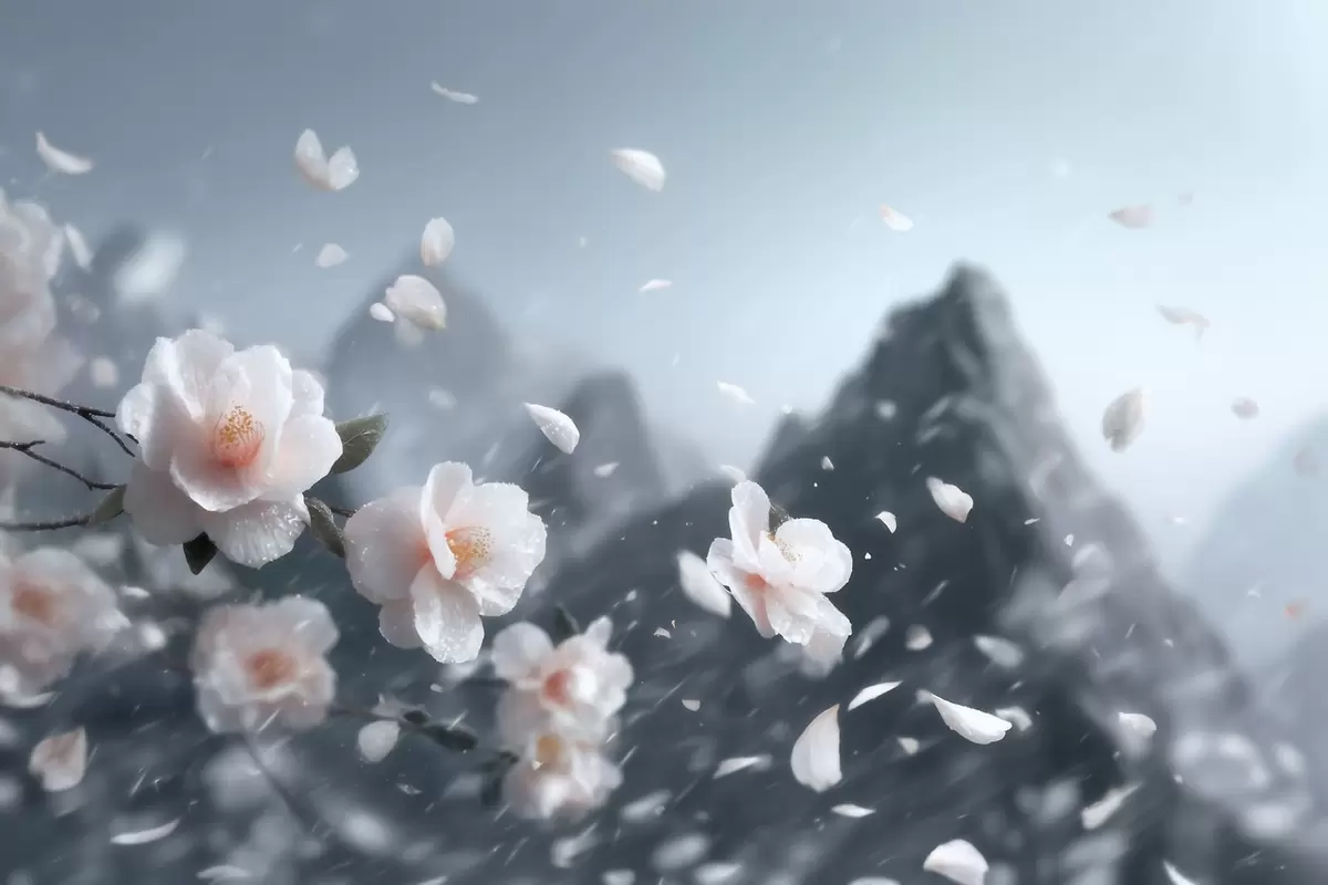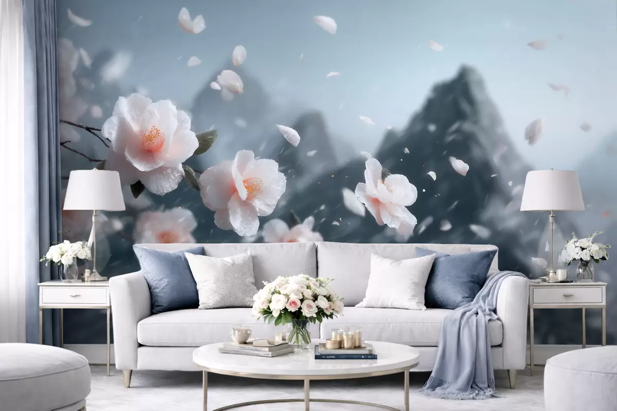 Fototapet Flori delicate de cireș înflorit pe fundalul munților, peisaj japonez plin de atmosferă în nuanțe pastelate Nr. w09808