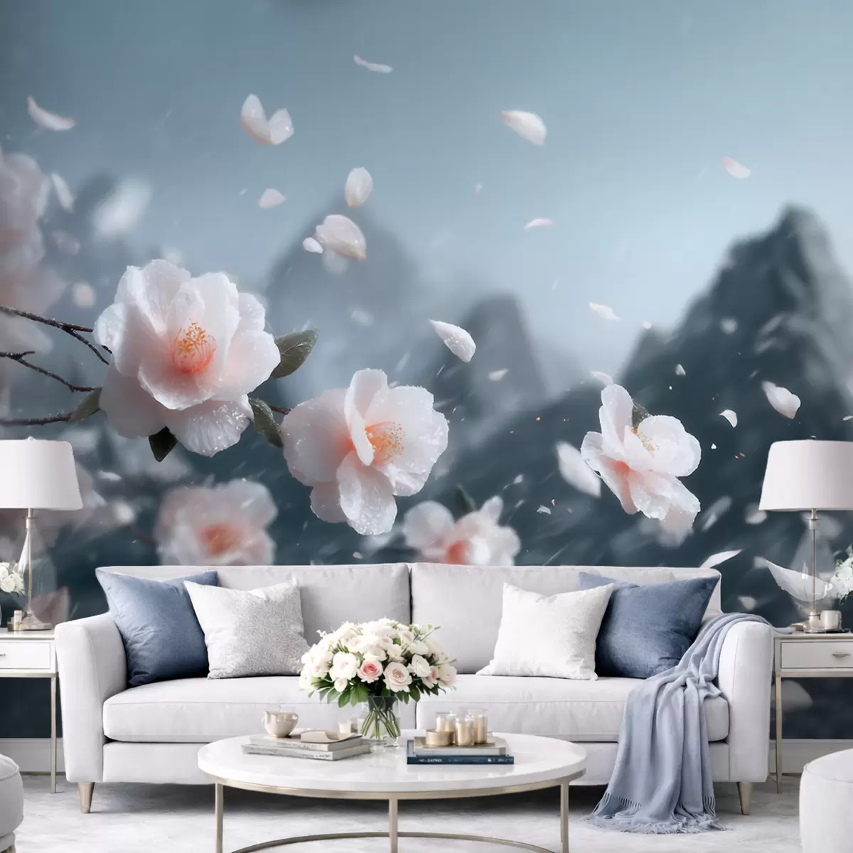 Fototapet Flori delicate de cireș înflorit pe fundalul munților, peisaj japonez plin de atmosferă în nuanțe pastelate Nr. w09808