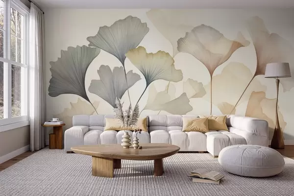 Fototapet Frunze de ginkgo abstractizate, în nuanțe pastelate discrete precum albastru, verde și piersic, lucrare artistică cu textură Nr. w09810