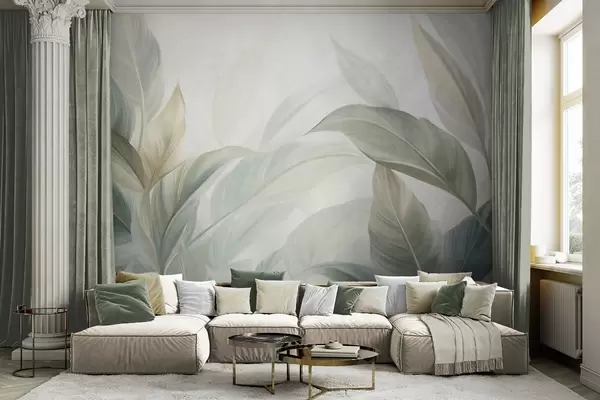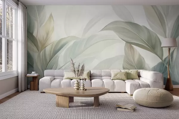 Fototapet Frunze tropicale mari, de un verde pal, cu nuanțe delicate, pastelate, și texturi artistice Nr. w09816