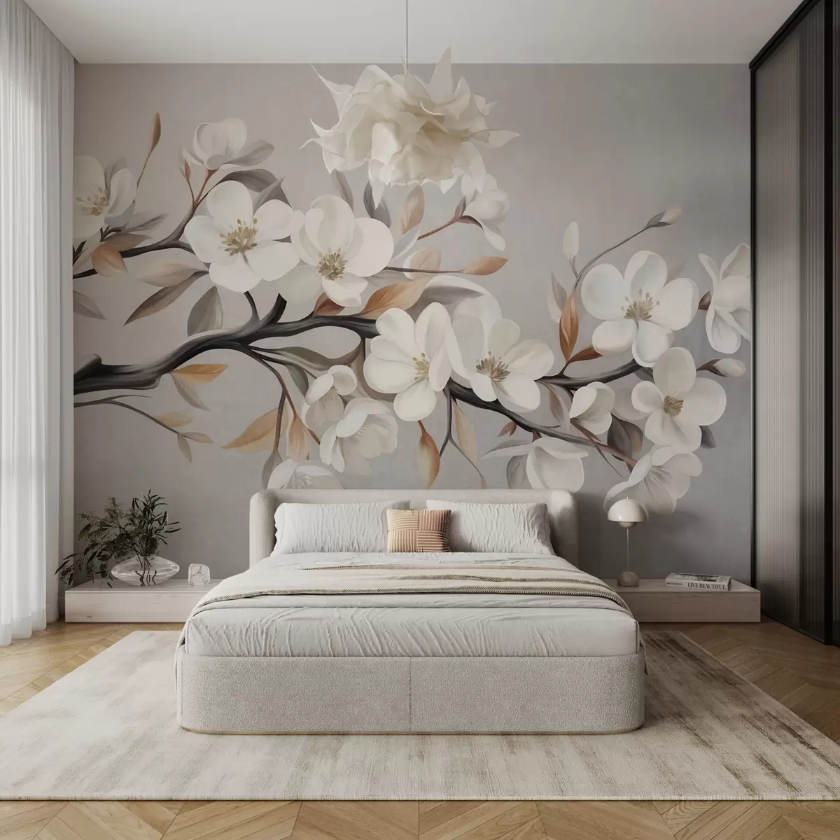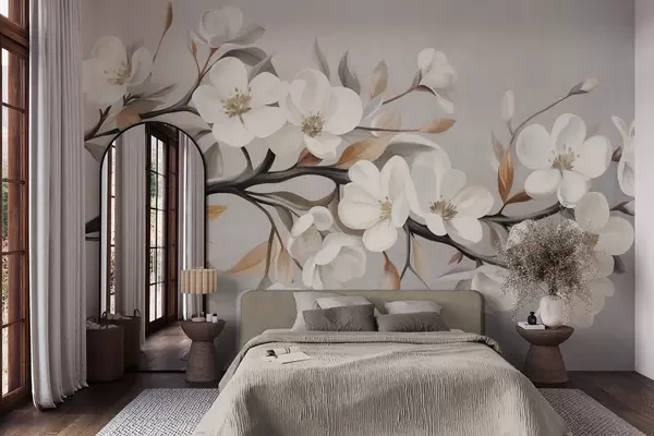 Fototapet O ramură cu textură, cu flori albe și frunze maronii, pe un fundal gri deschis Nr. w09817
