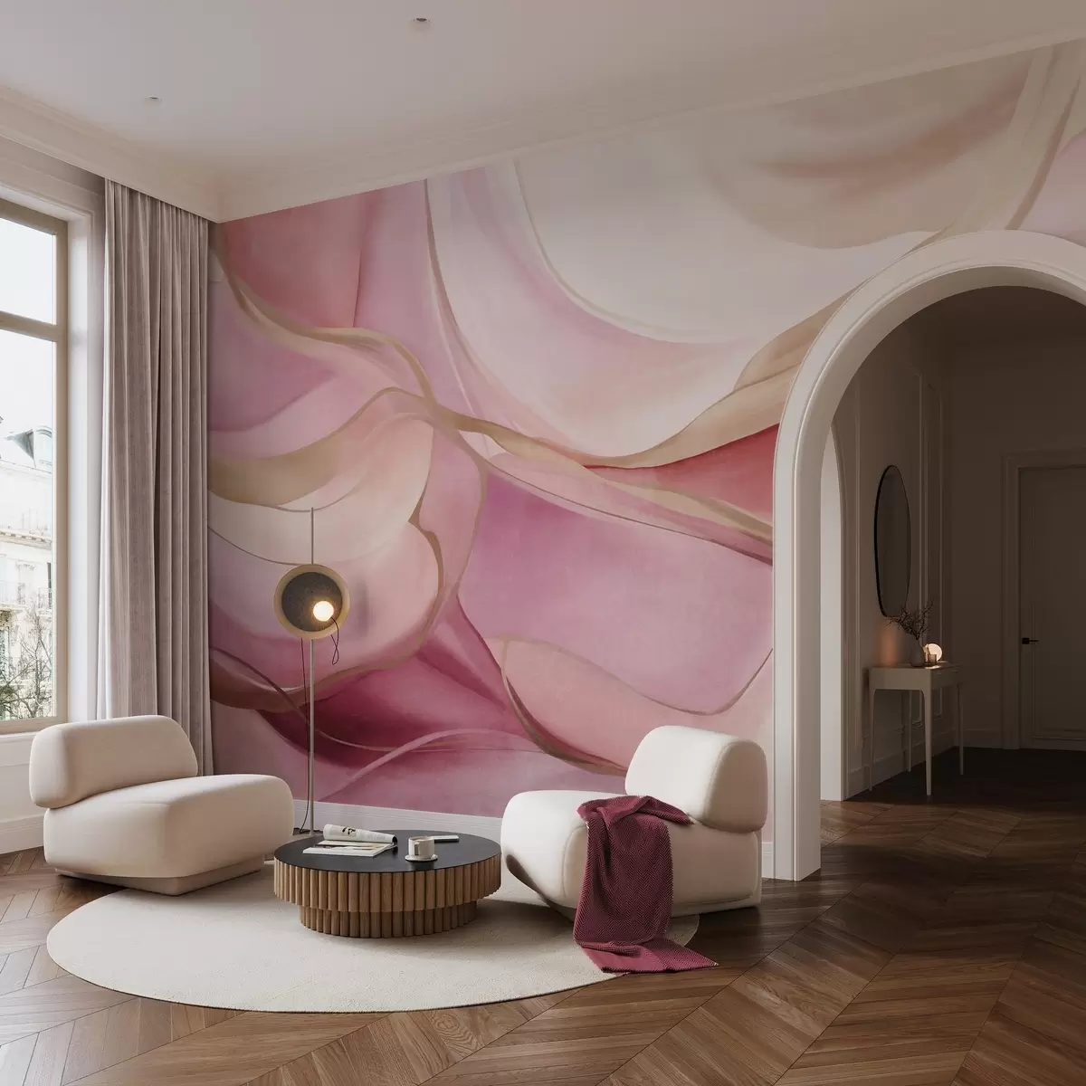 Fototapet Forme fluide, abstracte și texturate, în nuanțe de roz și bej, cu linii delicate de culoare galbenă Nr. w09818