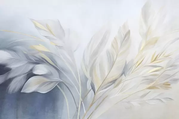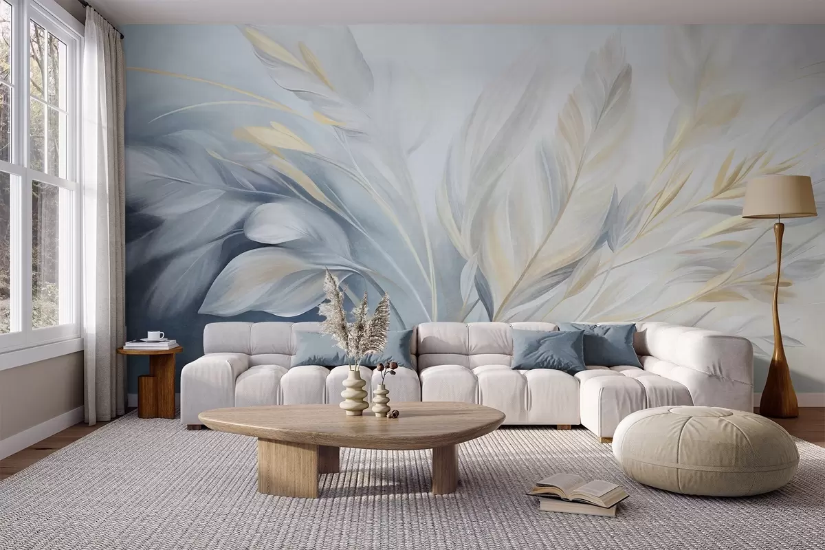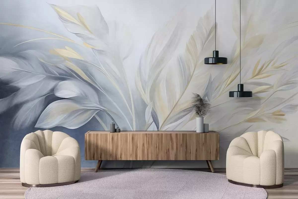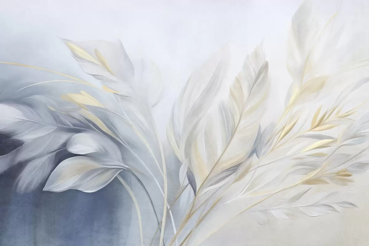 Fototapet Pene cu textură și accente galbene, pe un fundal delicat de albastru pal și alb Nr. w09826